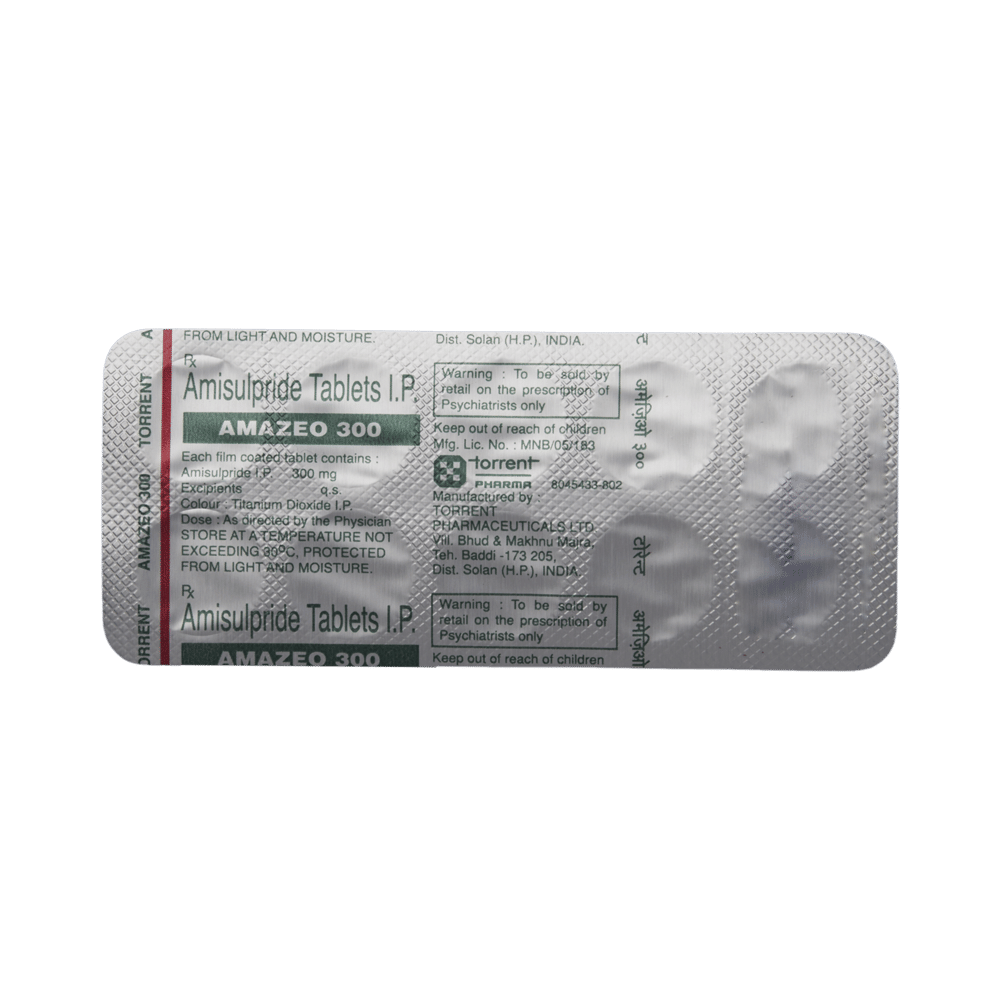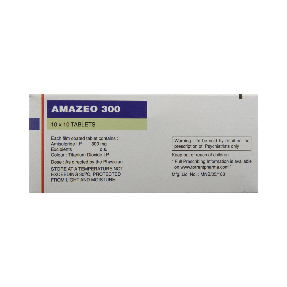 Amazeo 300 Tablet is an atypical antipsychotic. It works by modulating the action of certain chemical messengers in the brain that affect thoughts.