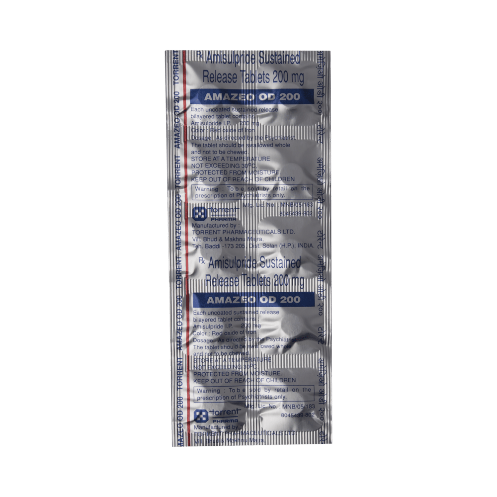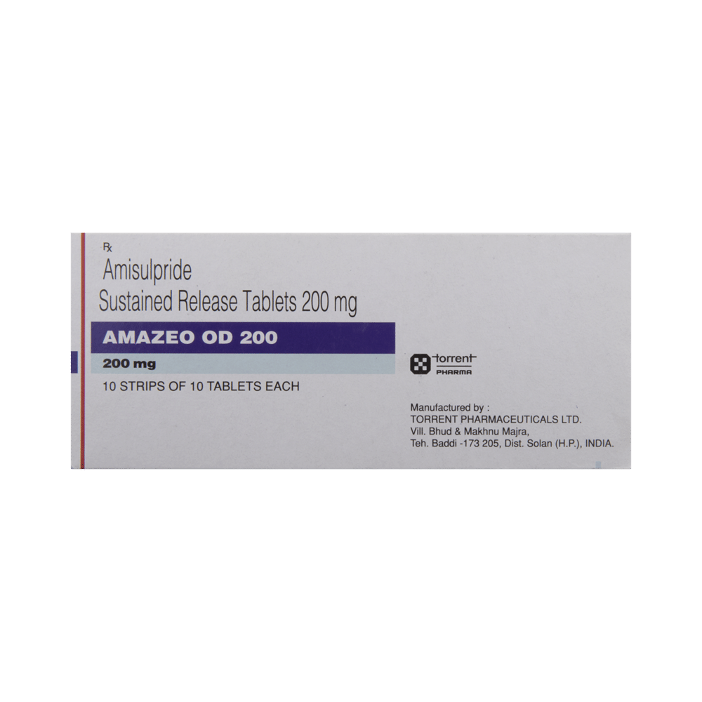 Amazeo OD 200 Tablet SR is an atypical antipsychotic. It works by modulating the action of certain chemical messengers in the brain that affect thoughts.