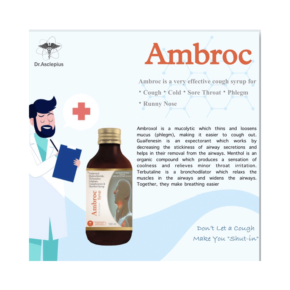 Ambroc Syrup is a combination medicine used to treat cough. It thins the mucus in the nose and windpipe, making it easier to cough out. This medicine also relieves throat irritation and provides cooling sensation. Ambroc Syrup is taken with or without food in a dose and duration as advised by the doctor. The dose you are given will depend on your condition and how you respond to the medicine. You should keep taking this medicine for as long as your doctor recommends. If you stop treatment too early your symptoms may come back and your condition may worsen. Let your doctor know about all other medications you are taking as some may affect, or be affected by this medicine.The most common side effects are nausea, diarrhea, vomiting, stomach discomfort, headache, rash, tremor, and increased heart rate. Most of these are temporary and usually resolve with time. Contact your doctor straight away if you are at all concerned about any of these side effects. This medicine can also cause sleepiness, so do not drive or do anything that requires mental focus until you know how this medicine affects you. Avoid drinking alcohol while taking this medicine as it can make sleepiness worse.Never support self-medication or recommend your medicine to another person. It is beneficial to have plenty of fluids while taking this medication. Before taking this medicine, you should tell your doctor if you are pregnant, planning pregnancy or breastfeeding.