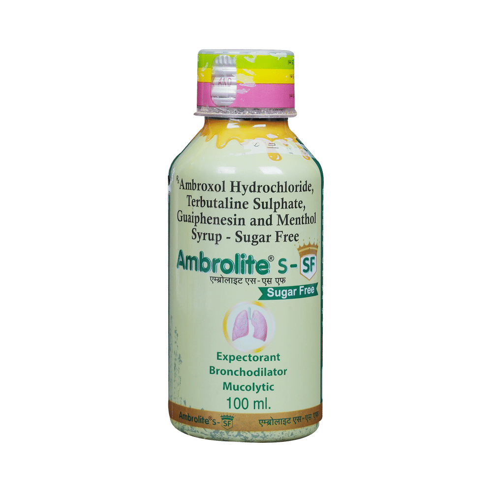 Ambrolite S-SF Syrup Sugar Free is a combination medicine used to treat cough. It thins the mucus in the nose and windpipe, making it easier to cough out. This medicine also relieves throat irritation and provides cooling sensation. Ambrolite S-SF Syrup Sugar Free is taken with or without food in a dose and duration as advised by the doctor. The dose you are given will depend on your condition and how you respond to the medicine. You should keep taking this medicine for as long as your doctor recommends. If you stop treatment too early your symptoms may come back and your condition may worsen. Let your doctor know about all other medications you are taking as some may affect, or be affected by this medicine.The most common side effects are nausea, diarrhea, vomiting, stomach discomfort, headache, rash, tremor, and increased heart rate. Most of these are temporary and usually resolve with time. Contact your doctor straight away if you are at all concerned about any of these side effects. This medicine can also cause sleepiness, so do not drive or do anything that requires mental focus until you know how this medicine affects you. Avoid drinking alcohol while taking this medicine as it can make sleepiness worse.Never support self-medication or recommend your medicine to another person. It is beneficial to have plenty of fluids while taking this medication. Before taking this medicine, you should tell your doctor if you are pregnant, planning pregnancy or breastfeeding.