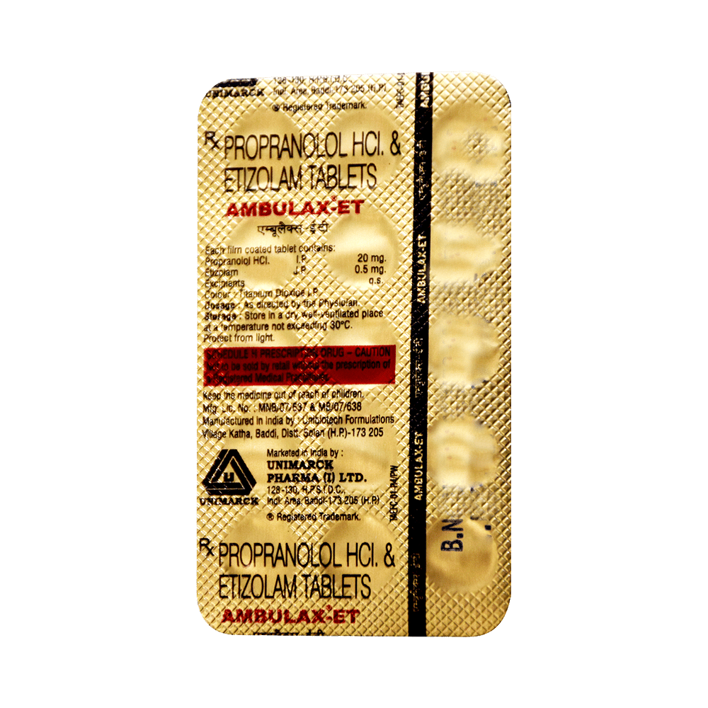 Ambulax-ET Tablet is a combination of two medicines: Etizolam and Propranolol. Etizolam is a benzodiazepine. It works by increasing the action of GABA, a chemical messenger which suppresses the abnormal and excessive activity of the nerve cells in brain. Propranolol is a beta blocker which blocks the action of certain chemical messengers on the heart and blood vessels. This reduces heart rate, blood pressure, and strain on the heart.