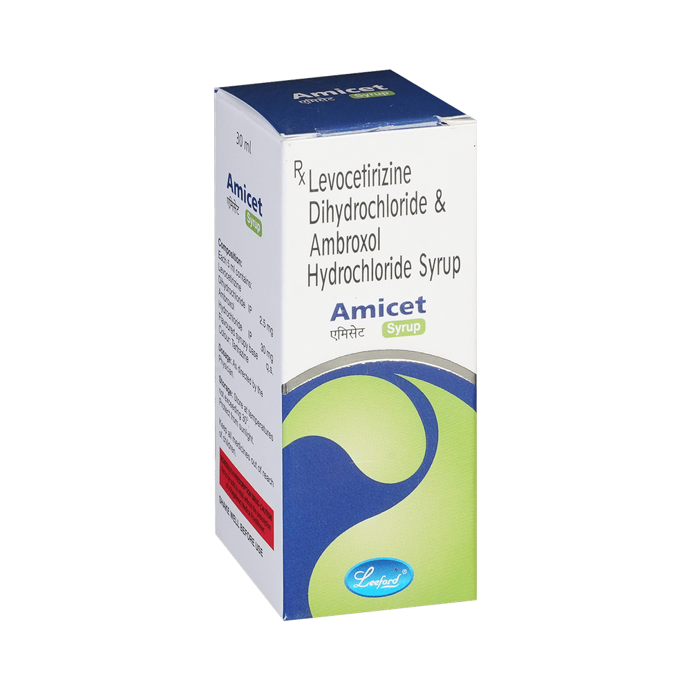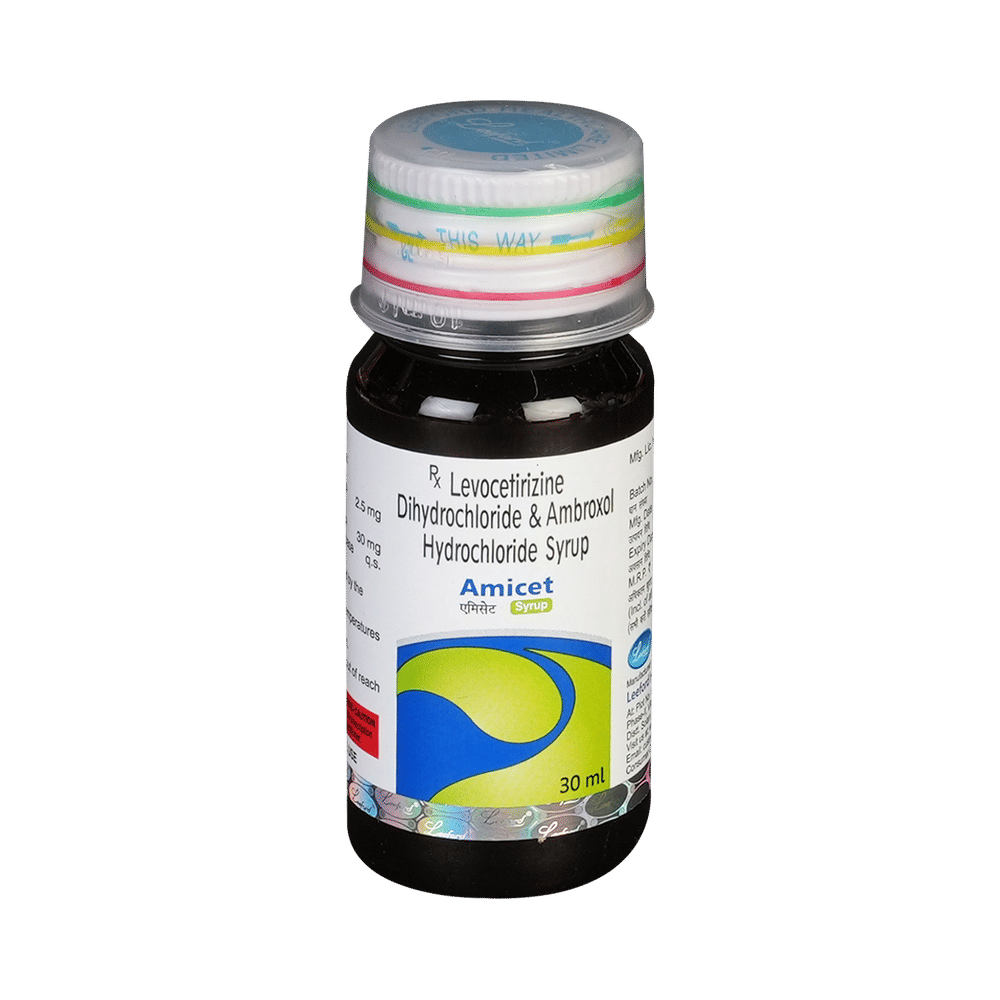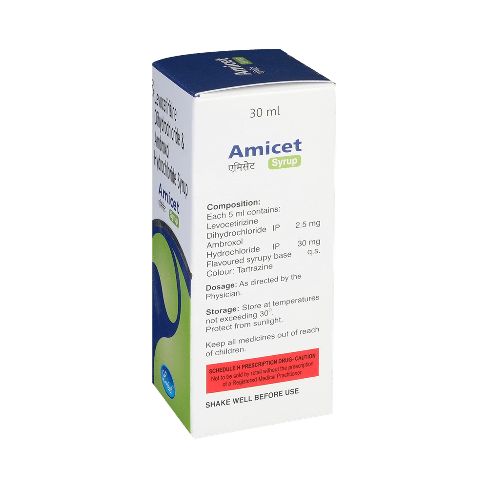 Amicet Syrup is a combination medicine used in the treatment of cough. It relieves allergic symptoms such as sneezing, running nose, watery eyes, itching, swelling, and congestion or stiffness. It also thins and loosens mucus, making it easier to cough out. Amicet Syrup is taken with or without food in a dose and duration as advised by the doctor. The dose you are given will depend on your condition and how you respond to the medicine. You should keep taking this medicine for as long as your doctor recommends. If you stop treatment too early your symptoms may come back and your condition may worsen. Let your doctor know about all other medications you are taking as some may affect, or be affected by this medicine.The most common side effects are stomach upset, dryness in mouth, headache, fatigue, and allergic reaction. Most of these are temporary and usually resolve with time. Contact your doctor straight away if you are at all concerned about any of these side effects. This medicine can also cause dizziness and sleepiness, so do not drive or do anything that requires mental focus until you know how this medicine affects you. Avoid drinking alcohol while taking this medicine as it can make dizziness worse.Never support self-medication or recommend your medicine to another person. It is beneficial to have plenty of fluids while taking this medication. Before taking it, you should tell your doctor if you have any kidney and liver diseases. Pregnant or breastfeeding women should also consult their doctor before taking this medicine.
