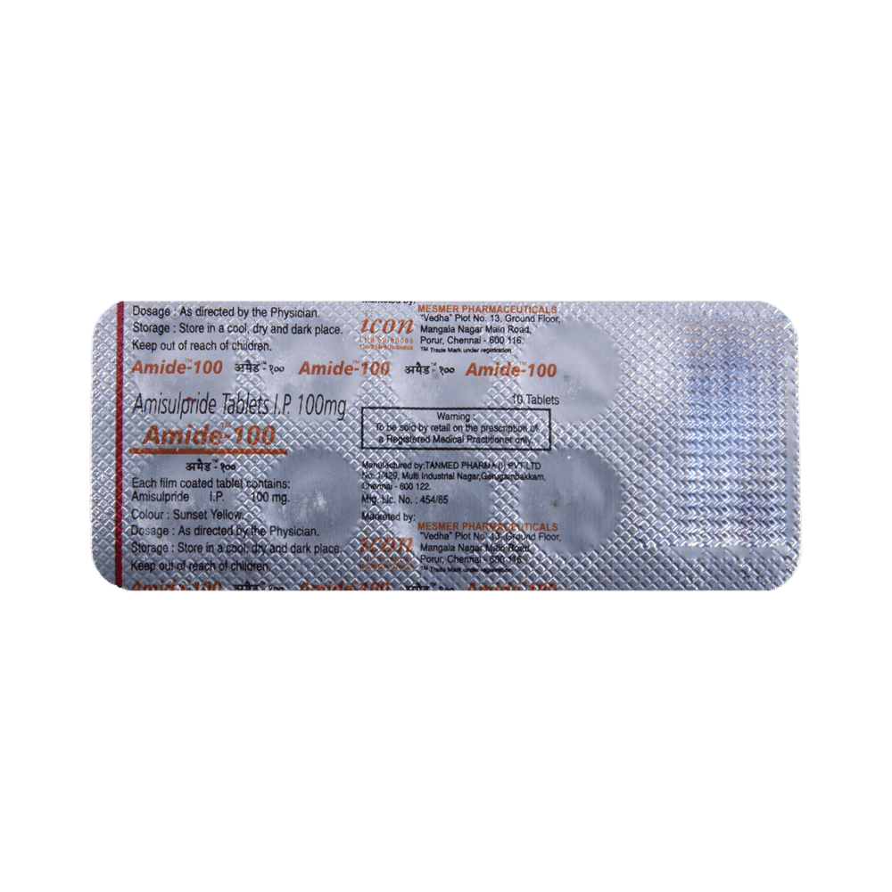 Amide 100 Tablet is a prescription medicine used in the treatment of schizophrenia, a mental disorder that can result in hallucinations or delusions and also adversely affects a person’s ability to think and behave. Amide 100 Tablet may be taken with or without food, preferably before bedtime. However, it is advised to take it at the same time each day as this helps to maintain a consistent level of medicine in the body. Take this medicine in the dose and duration as advised by your doctor and if you have missed a dose, take it as soon as you remember. Do not skip any doses and finish the full course of treatment even if you feel better. It is important that this medication is not stopped suddenly without talking to your doctor as it may worsen your symptoms.Some common side effects of this medicine include nausea, vomiting, dryness in the mouth, blurred vision, insomnia, and erectile dysfunction. Initially, this medicine may cause a sudden drop in blood pressure when you change positions, so it is better to rise slowly if you have been sitting or lying down. It also causes dizziness and sleepiness, so do not drive or do anything that requires mental focus until you know how this medicine affects you. This medicine can lead to weight gain and may increase your blood sugar and cholesterol levels. However, modifying your lifestyle by having a healthy diet and exercising regularly can reduce this side effect.