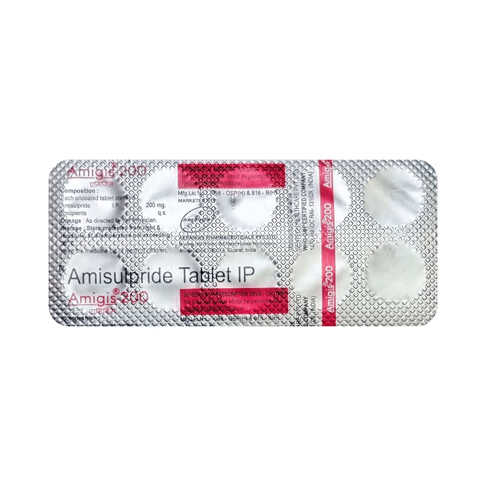Amigis 200 Tablet is a prescription medicine used in the treatment of schizophrenia, a mental disorder that can result in hallucinations or delusions and also adversely affects a person’s ability to think and behave. Amigis 200 Tablet may be taken with or without food, preferably before bedtime. However, it is advised to take it at the same time each day as this helps to maintain a consistent level of medicine in the body. Take this medicine in the dose and duration as advised by your doctor and if you have missed a dose, take it as soon as you remember. Do not skip any doses and finish the full course of treatment even if you feel better. It is important that this medication is not stopped suddenly without talking to your doctor as it may worsen your symptoms.Some common side effects of this medicine include nausea, vomiting, dryness in the mouth, blurred vision, insomnia, and erectile dysfunction. Initially, this medicine may cause a sudden drop in blood pressure when you change positions, so it is better to rise slowly if you have been sitting or lying down. It also causes dizziness and sleepiness, so do not drive or do anything that requires mental focus until you know how this medicine affects you. This medicine can lead to weight gain and may increase your blood sugar and cholesterol levels. However, modifying your lifestyle by having a healthy diet and exercising regularly can reduce this side effect.