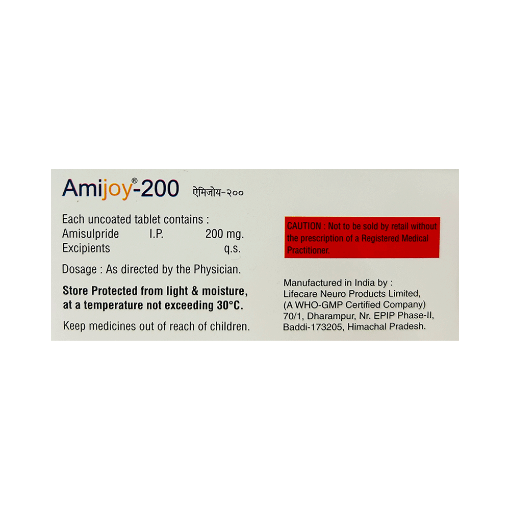 AMIjoy 200 Tablet is an atypical antipsychotic. It works by modulating the action of certain chemical messengers in the brain that affect thoughts.