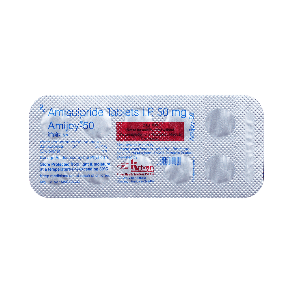 AMIjoy 50 Tablet is an atypical antipsychotic. It works by modulating the action of certain chemical messengers in the brain that affect thoughts.