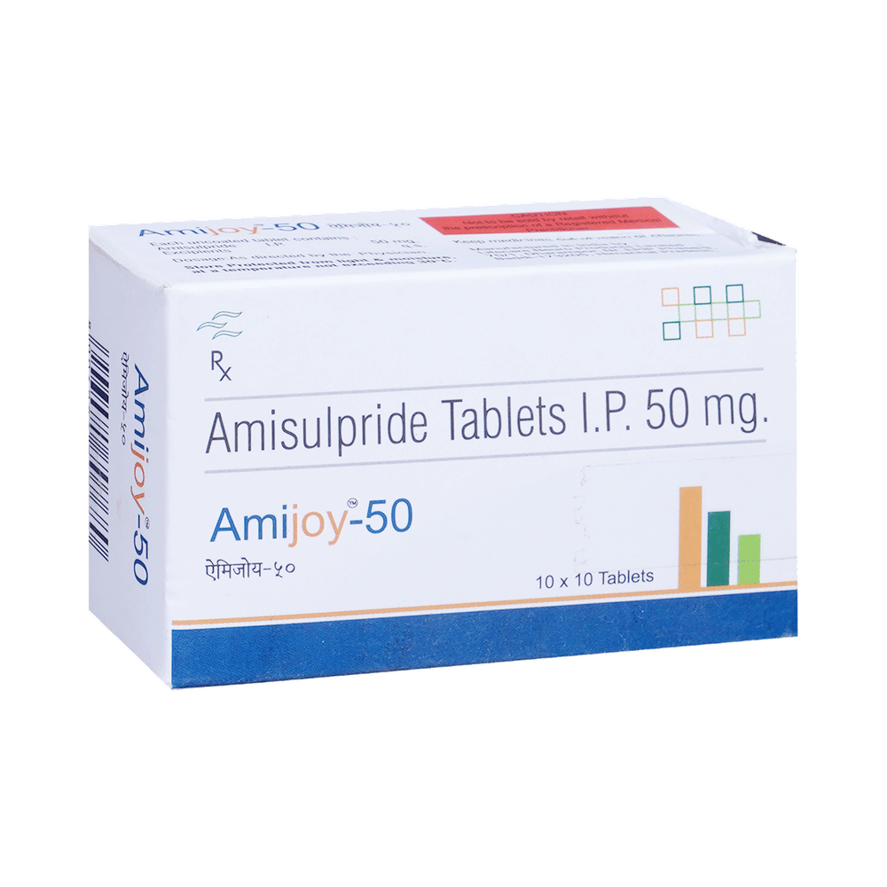 AMIjoy 50 Tablet is a prescription medicine used in the treatment of schizophrenia, a mental disorder that can result in hallucinations or delusions and also adversely affects a person’s ability to think and behave. AMIjoy 50 Tablet may be taken with or without food, preferably before bedtime. However, it is advised to take it at the same time each day as this helps to maintain a consistent level of medicine in the body. Take this medicine in the dose and duration as advised by your doctor and if you have missed a dose, take it as soon as you remember. Do not skip any doses and finish the full course of treatment even if you feel better. It is important that this medication is not stopped suddenly without talking to your doctor as it may worsen your symptoms.Some common side effects of this medicine include nausea, vomiting, dryness in the mouth, blurred vision, insomnia, and erectile dysfunction. Initially, this medicine may cause a sudden drop in blood pressure when you change positions, so it is better to rise slowly if you have been sitting or lying down. It also causes dizziness and sleepiness, so do not drive or do anything that requires mental focus until you know how this medicine affects you. This medicine can lead to weight gain and may increase your blood sugar and cholesterol levels. However, modifying your lifestyle by having a healthy diet and exercising regularly can reduce this side effect.