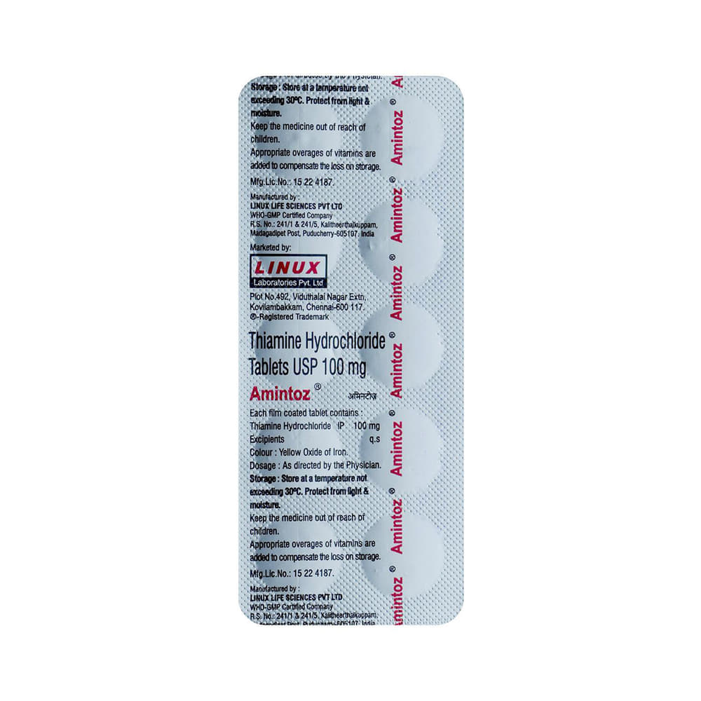 amiNTOZ 100mg Tablet is a supplement of vitamin B1. It is used in the treatment of vitamin B1 deficiency. It is an important nutrient which helps the body to perform various functions. amiNTOZ 100mg Tablet is also used for digestive problems including poor appetite, ulcerative colitis, and ongoing diarrhea. You should take it in the dose and duration as advised by your doctor. This medicine may be only part of a complete program of treatment that also includes making changes to your diet and taking other medicines and supplements.amiNTOZ 100mg Tablet may cause a few side effects such as allergic reactions, skin irritation, cough, and decreased in blood pressure in some patients. Before taking the medicine, let your doctor know all the other medicines you are taking to make sure you are safe.
