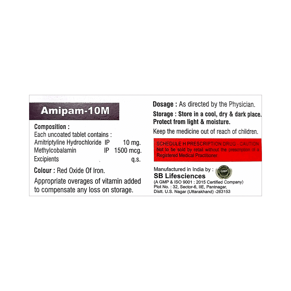 Amipam 10M Tablet is a combination of two medicines used to treat neuropathic pain. It works by protecting the nerve fibers against damage, repairing the damaged nerves. This way it effectively relieves the pain sensation and also elevates the mood. Amipam 10M Tablet may be taken with or without food. However, it is advised to take it at the same time each day as this helps to maintain a consistent level of medicine in the body. Take this medicine in the dose and duration advised by your doctor. If you miss a dose of this medicine, take it as soon as you remember. Finish the full course of the treatment even if you feel better. It is important not to stop taking this medicine suddenly.Some common side effects of this medicine include constipation, dry mouth, difficulty in urination, drowsiness, blurred vision, and increased heart rate. It may also cause dizziness and sleepiness, so do not drive or do anything that requires mental focus until you know how this medicine affects you. However, these are temporary and usually resolve on their own. Please consult your doctor if these do not subside or bother you.You should avoid alcohol while taking Amipam 10M Tablet, as it may worsen certain side effects. This medicine can also lead to weight gain, eat a healthy balanced diet, avoid snacking with high-calorie food, and exercise regularly. Inform your doctor if you develop any unusual changes in mood or behavior, new or worsening depression, or suicidal thoughts or behavior.