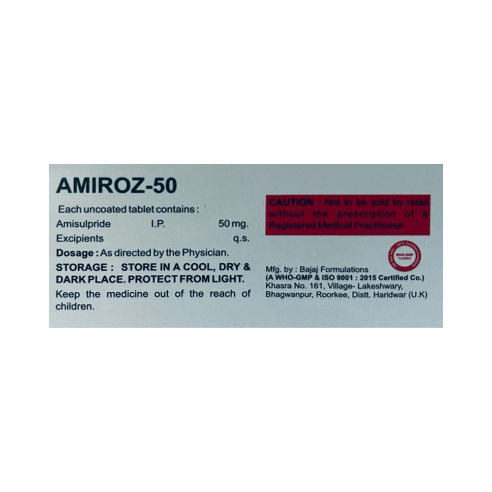 Amiroz 50 Tablet is an atypical antipsychotic. It works by modulating the action of certain chemical messengers in the brain that affect thoughts.