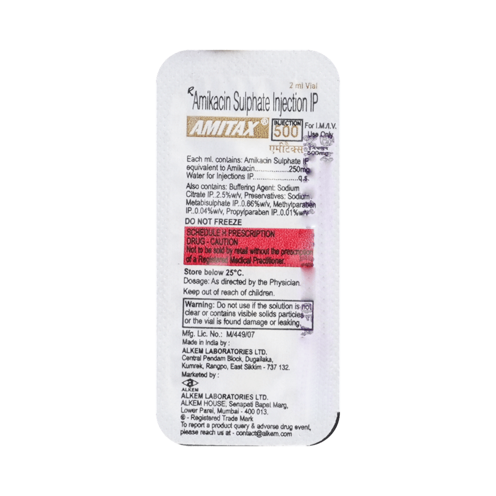Amitax 500mg Injection is an antibiotic used to prevent or treat various bacterial infections. These may include infections of the urinary tract, bones, joints, lungs (e.g., pneumonia), brain, blood, etc. It is also used in hospitalized patients to prevent infections. Amitax 500mg Injection works by stopping the growth of bacteria. It is given as a drip (intravenous infusion) or as an injection directly into a vein or a muscle under the supervision of a doctor and should not be self-administered. It should be used regularly at evenly spaced time intervals as prescribed by your doctor. Do not skip any doses and finish the full course of treatment even if you feel better. Stopping the medicine too early may lead to the infection returning or worsening.Common side effects of this medicine include injection site reactions, kidney problems, and hearing problems. Consult your doctor if any of these side effects persist or if your condition does not improve despite treatment.Some patients receiving high doses may develop balance disorder (loss of balance), kidney damage, and hearing loss. Therefore, please follow all the instructions given by your doctor while using this medicine. Your doctor may also monitor you with regular kidney function tests, hearing tests, and urine tests during treatment. This medication is not recommended for use during pregnancy. Inform your doctor if you are pregnant, planning to conceive, or breastfeeding.