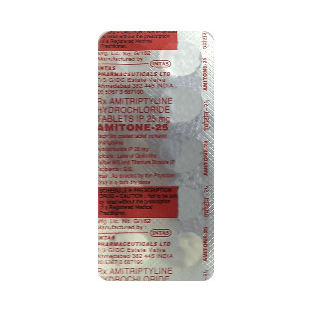 amiTONE 25mg Tablet is a medicine used to treat depression by helping improve mood and reduce anxiety. It works by restoring the natural balance of certain brain chemicals that affect emotions. This helps relieve sadness, improves mental well-being, and makes daily life easier to manage. amiTONE 25mg Tablet is normally taken before bedtime because it can make you sleepy. It can be taken with or without food. The dose and how often you need to take it will be decided by your doctor so that you get the right amount to control your symptoms.How long you need to use it will depend on what you are taking it for, but it is important to continue taking this medication even if you feel well. Do not stop taking the medicine suddenly without talking to your doctor. Stopping the medicine suddenly can worsen your condition or cause other symptoms. Your dose may be modified or gradually decreased before stopping the medication.The most common side effects of this medicine include constipation, dry mouth, sleepiness, dizziness, and headache. It may also make you aggressive or confused, and can cause weight gain in some people.This medicine is not addictive, but you can experience additional side effects (withdrawal symptoms) if you stop taking it suddenly. Your doctor may be able to suggest ways of preventing or reducing side effects if they bother you or do not go away. Serious side effects associated with this medicine are rare.