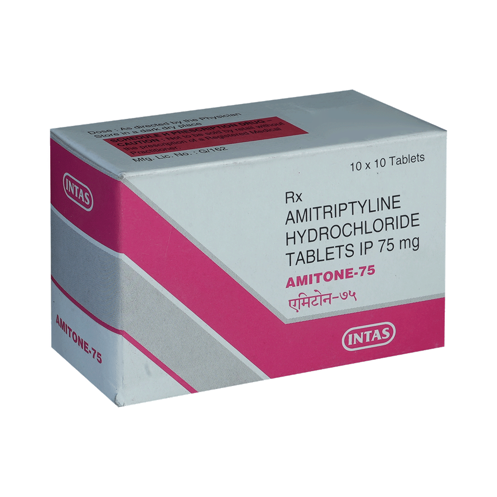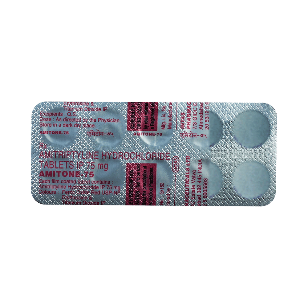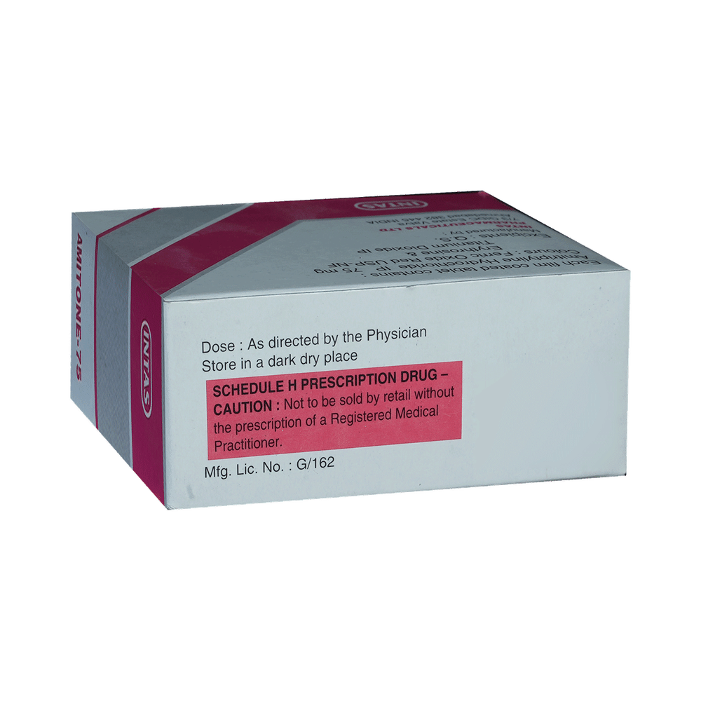 amiTONE 75mg Tablet is a medicine used to treat depression by helping improve mood and reduce anxiety. It works by restoring the natural balance of certain brain chemicals that affect emotions. This helps relieve sadness, improves mental well-being, and makes daily life easier to manage. amiTONE 75mg Tablet is normally taken before bedtime because it can make you sleepy. It can be taken with or without food. The dose and how often you need to take it will be decided by your doctor so that you get the right amount to control your symptoms.How long you need to use it will depend on what you are taking it for, but it is important to continue taking this medication even if you feel well. Do not stop taking the medicine suddenly without talking to your doctor. Stopping the medicine suddenly can worsen your condition or cause other symptoms. Your dose may be modified or gradually decreased before stopping the medication.The most common side effects of this medicine include constipation, dry mouth, sleepiness, dizziness, and headache. It may also make you aggressive or confused, and can cause weight gain in some people.This medicine is not addictive, but you can experience additional side effects (withdrawal symptoms) if you stop taking it suddenly. Your doctor may be able to suggest ways of preventing or reducing side effects if they bother you or do not go away. Serious side effects associated with this medicine are rare.