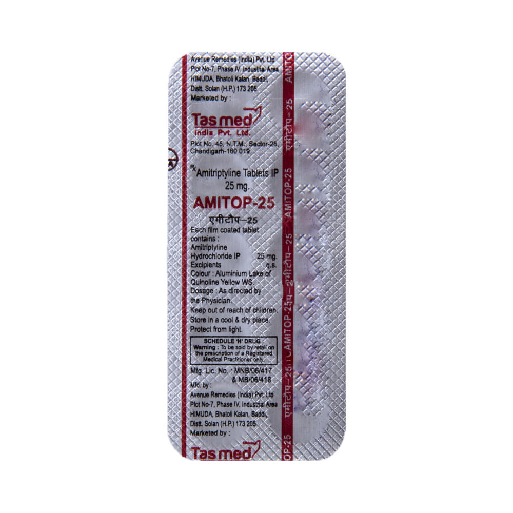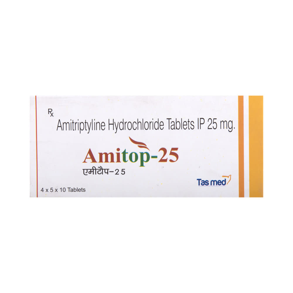 Amitop 25 Tablet is a medicine used to treat depression by helping improve mood and reduce anxiety. It works by restoring the natural balance of certain brain chemicals that affect emotions. This helps relieve sadness, improves mental well-being, and makes daily life easier to manage. Amitop 25 Tablet is normally taken before bedtime because it can make you sleepy. It can be taken with or without food. The dose and how often you need to take it will be decided by your doctor so that you get the right amount to control your symptoms.How long you need to use it will depend on what you are taking it for, but it is important to continue taking this medication even if you feel well. Do not stop taking the medicine suddenly without talking to your doctor. Stopping the medicine suddenly can worsen your condition or cause other symptoms. Your dose may be modified or gradually decreased before stopping the medication.The most common side effects of this medicine include constipation, dry mouth, sleepiness, dizziness, and headache. It may also make you aggressive or confused, and can cause weight gain in some people.This medicine is not addictive, but you can experience additional side effects (withdrawal symptoms) if you stop taking it suddenly. Your doctor may be able to suggest ways of preventing or reducing side effects if they bother you or do not go away. Serious side effects associated with this medicine are rare.
