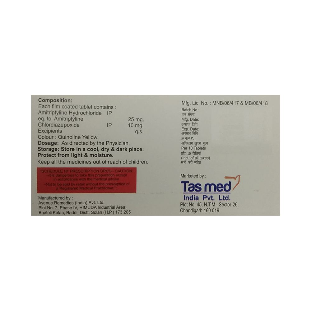 Salt Composition: Amitriptyline (25mg) + Chlordiazepoxide (10mg)