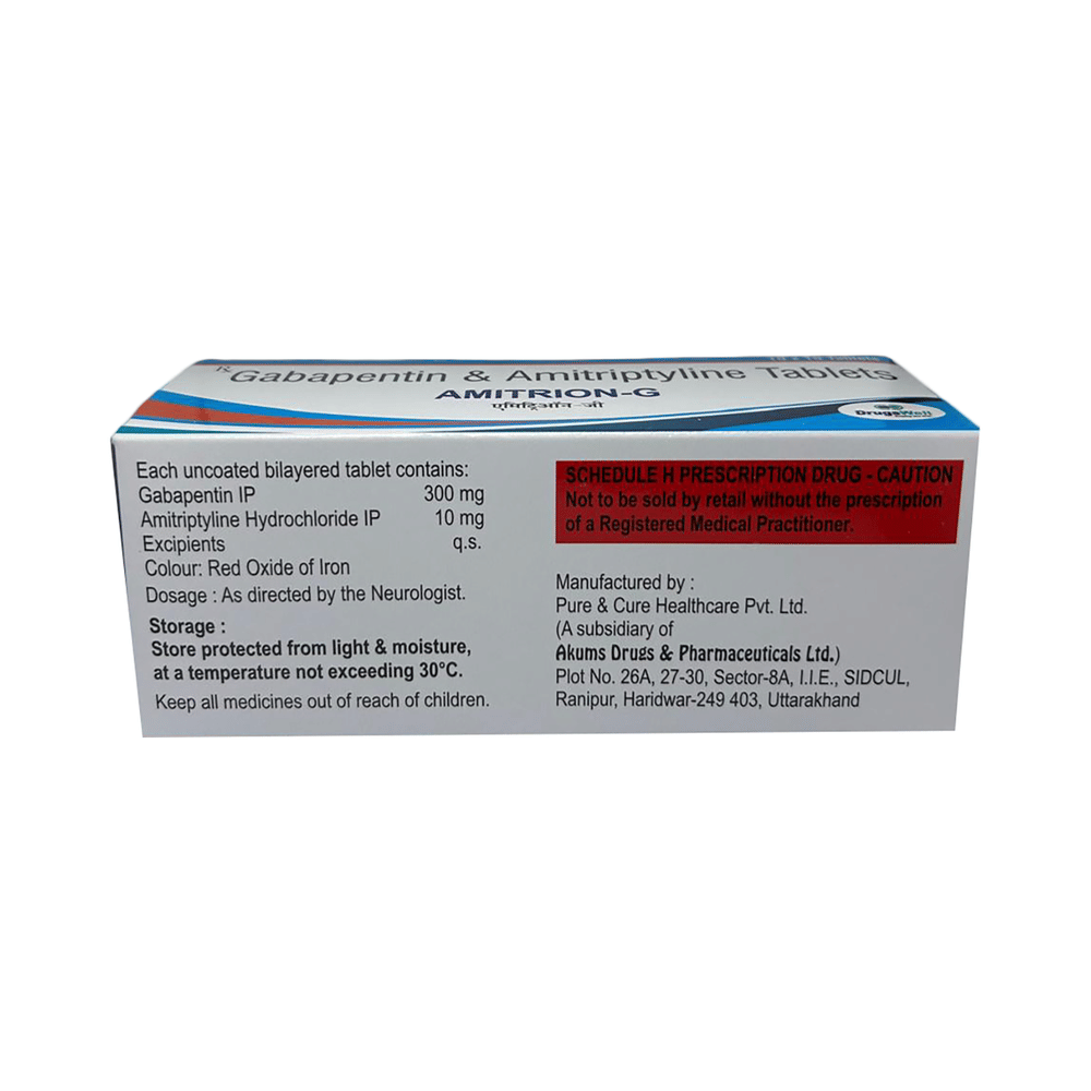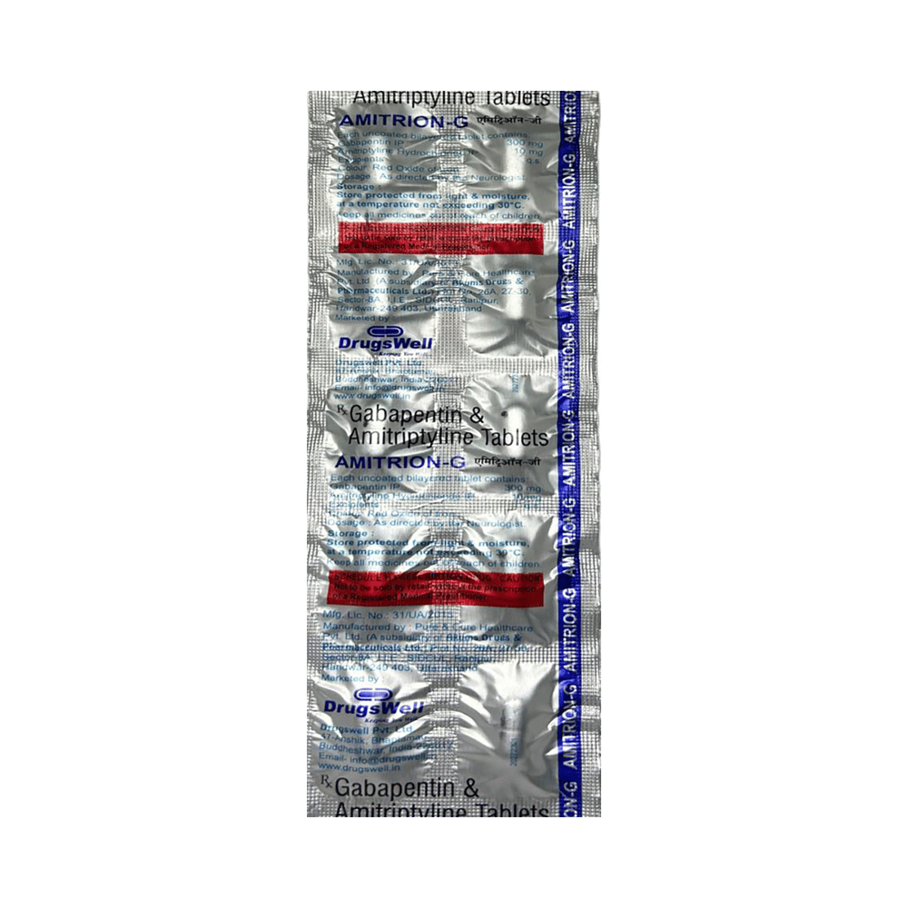 Amitrion-G Tablet is a combination medicine used for the treatment of neuropathic pain. It works by increasing the level of chemical messengers in the brain. This helps in regulating the mood and stopping the movement of pain signals from nerves to the brain. Amitrion-G Tablet is taken by mouth with or without food, preferably at bedtime. It is advised to take it at the same time each day as this helps to maintain a consistent level of medicine in the body. Take this medicine in the dose and duration advised by your doctor. If you miss a dose of this medicine, take it as soon as you remember. Finish the full course of the treatment even if you feel better. It is important that this medication is not stopped suddenly without talking to the doctor as it may increase the seizure frequency and can be life-threatening in some cases. Avoid taking antacids with this medicine as antacids make it harder for your body to absorb this medicine.Some common side effects of this medicine are constipation, difficulty in urination, weight gain, and dryness in mouth. It may also cause dizziness and sleepiness, so do not drive or do anything that requires mental focus until you know how this medicine affects you. This medicine may cause weight gain and to control it, you should exercise regularly and take a balanced diet.Before taking this medicine let your doctor know if you suffer from kidney or liver disease. Your doctor should also know about all other medicines you are taking as many of these may make this medicine less effective or change the way it works. Inform your doctor if you are pregnant, planning pregnancy or breastfeeding.
