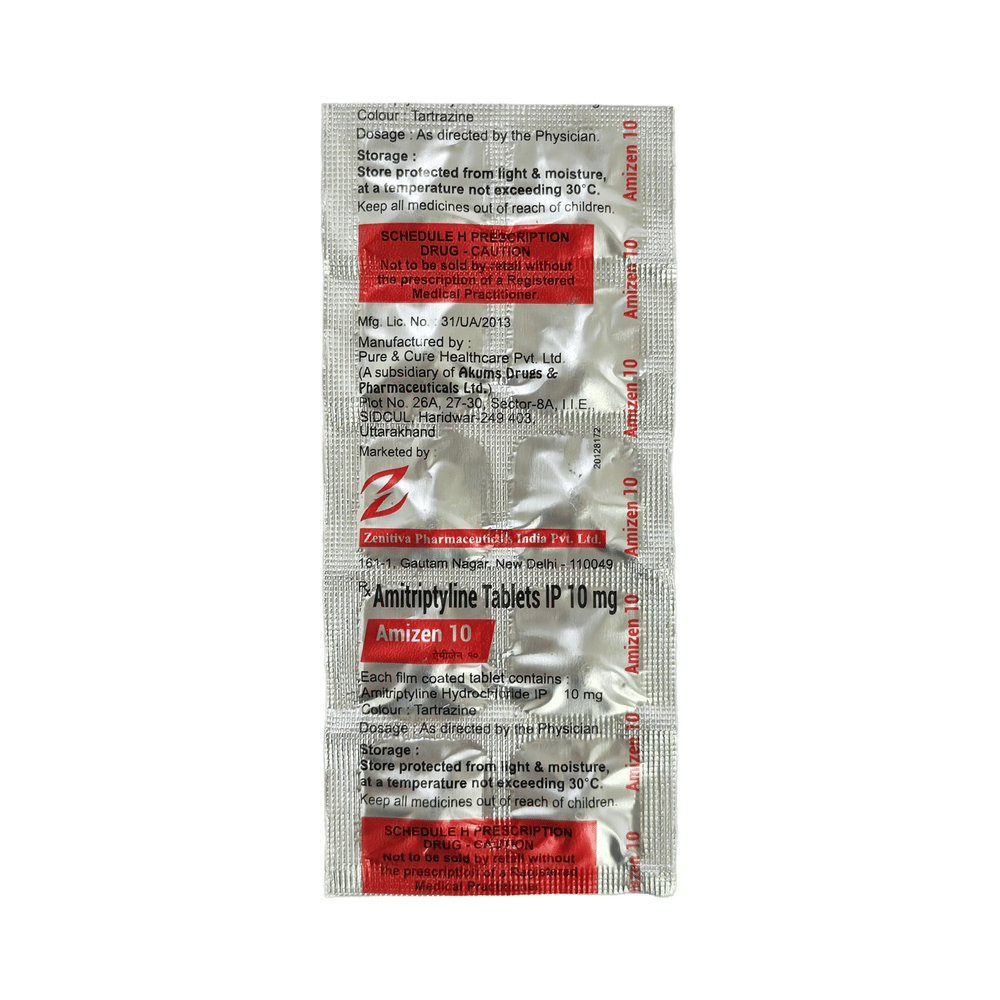 Amizen 10mg Tablet is a medicine used to treat depression by helping improve mood and reduce anxiety. It works by restoring the natural balance of certain brain chemicals that affect emotions. This helps relieve sadness, improves mental well-being, and makes daily life easier to manage. Amizen 10mg Tablet is normally taken before bedtime because it can make you sleepy. It can be taken with or without food. The dose and how often you need to take it will be decided by your doctor so that you get the right amount to control your symptoms.How long you need to use it will depend on what you are taking it for, but it is important to continue taking this medication even if you feel well. Do not stop taking the medicine suddenly without talking to your doctor. Stopping the medicine suddenly can worsen your condition or cause other symptoms. Your dose may be modified or gradually decreased before stopping the medication.The most common side effects of this medicine include constipation, dry mouth, sleepiness, dizziness, and headache. It may also make you aggressive or confused, and can cause weight gain in some people.This medicine is not addictive, but you can experience additional side effects (withdrawal symptoms) if you stop taking it suddenly. Your doctor may be able to suggest ways of preventing or reducing side effects if they bother you or do not go away. Serious side effects associated with this medicine are rare.