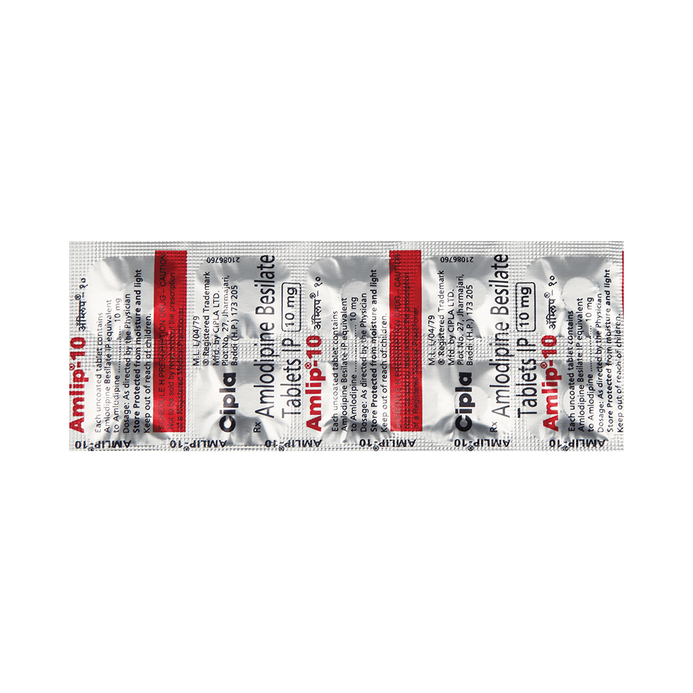 AMlip 10 Tablet is a calcium channel blocker. In high blood pressure, it normalizes the blood pressure by relaxing the blood vessels to reduce the pressure on them, thereby improving the blood flow in the body. In heart-related chest pain (angina), the enhanced blood flow in the body relaxes the heart muscles by reducing the workload on the heart. It also improves the oxygen flow in the body, thereby, preventing any heart-related chest pain.