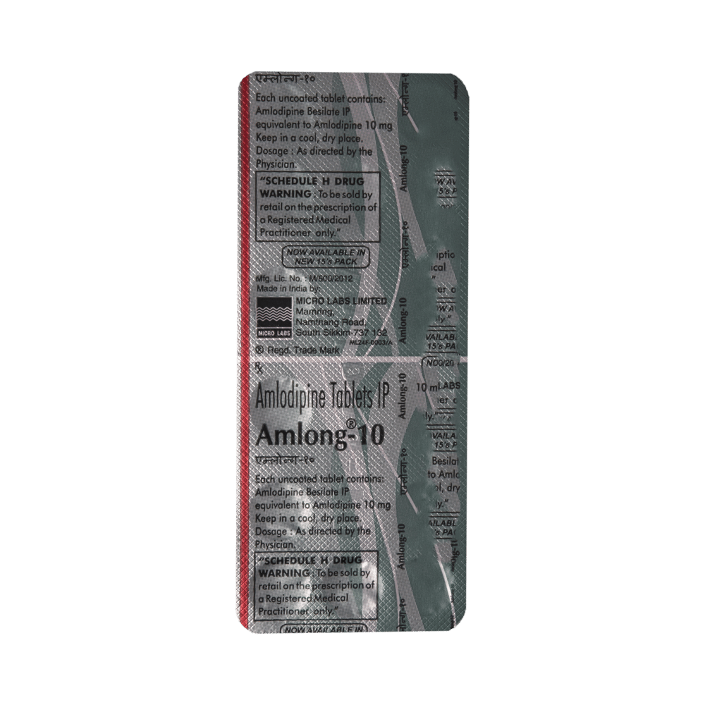 AMlong 10 Tablet belongs to a class of medicines known as calcium channel blockers. It is used to treat high blood pressure (hypertension) and prevent angina (heart-related chest pain). It lowers blood pressure and reduces the heart's workload, which helps prevent heart attacks and strokes. AMlong 10 Tablet may be prescribed alone or along with other medicines. The dose depends on what you are taking it for and the severity of your condition. You can take it at any time of the day, with or without food, but it is best to take it at about the same time each day. You should take this medicine for as long as it is prescribed for you. Even if you feel well, do not stop this medicine on your own because high blood pressure often has no symptoms. If you stop taking it, your condition may get worse. Keeping yourself active with regular exercise, managing your weight, and eating a healthy diet will also help control your blood pressure.The most common side effects include headache, edema, fatigue, nausea, abdominal pain, and somnolence. Consult your doctor if any of these side effects bother you or do not go away. They may be able to suggest ways to prevent or reduce the side effects. There has been reports of lichenoid keratosis (a benign, inflamed, solitary skin lesion, typically brownish or reddish, found on sun-exposed areas) in some patients taking AMlong 10 Tablet, if you experience this, let your doctor know.Before taking it, let your doctor know if you have any liver, heart, or kidney problems. Pregnant or breastfeeding women should also consult their doctor before taking this medicine. You also need to tell your doctor about all the other medicines you are taking, especially those used to treat high blood pressure or heart conditions. You should have your blood pressure checked regularly to make sure that this medicine is working properly.