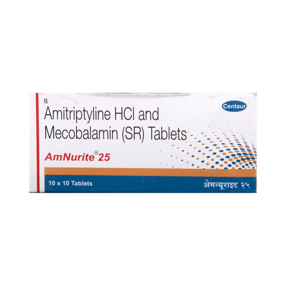 Amnurite 25 Tablet SR is a combination of two medicines used to treat neuropathic pain. It works by protecting the nerve fibers against damage, repairing the damaged nerves. This way it effectively relieves the pain sensation and also elevates the mood. Amnurite 25 Tablet SR may be taken with or without food. However, it is advised to take it at the same time each day as this helps to maintain a consistent level of medicine in the body. Take this medicine in the dose and duration advised by your doctor. If you miss a dose of this medicine, take it as soon as you remember. Finish the full course of the treatment even if you feel better. It is important not to stop taking this medicine suddenly.Some common side effects of this medicine include constipation, dry mouth, difficulty in urination, drowsiness, blurred vision, and increased heart rate. It may also cause dizziness and sleepiness, so do not drive or do anything that requires mental focus until you know how this medicine affects you. However, these are temporary and usually resolve on their own. Please consult your doctor if these do not subside or bother you.You should avoid alcohol while taking Amnurite 25 Tablet SR, as it may worsen certain side effects. This medicine can also lead to weight gain, eat a healthy balanced diet, avoid snacking with high-calorie food, and exercise regularly. Inform your doctor if you develop any unusual changes in mood or behavior, new or worsening depression, or suicidal thoughts or behavior.