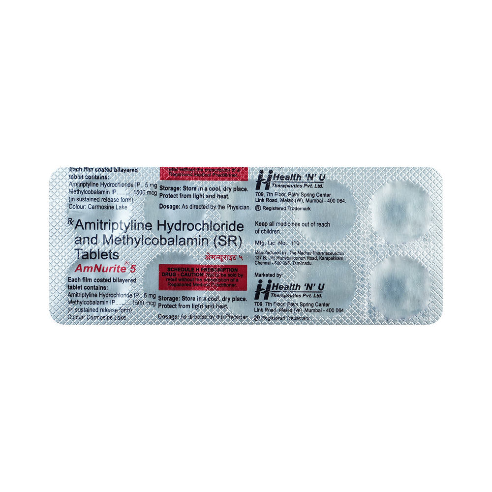 Amnurite 5 mg/1500 mcg Tablet is a combination of two medicines used to treat neuropathic pain. It works by protecting the nerve fibers against damage, repairing the damaged nerves. This way it effectively relieves the pain sensation and also elevates the mood. Amnurite 5 mg/1500 mcg Tablet may be taken with or without food. However, it is advised to take it at the same time each day as this helps to maintain a consistent level of medicine in the body. Take this medicine in the dose and duration advised by your doctor. If you miss a dose of this medicine, take it as soon as you remember. Finish the full course of the treatment even if you feel better. It is important not to stop taking this medicine suddenly.Some common side effects of this medicine include constipation, dry mouth, difficulty in urination, drowsiness, blurred vision, and increased heart rate. It may also cause dizziness and sleepiness, so do not drive or do anything that requires mental focus until you know how this medicine affects you. However, these are temporary and usually resolve on their own. Please consult your doctor if these do not subside or bother you.You should avoid alcohol while taking Amnurite 5 mg/1500 mcg Tablet, as it may worsen certain side effects. This medicine can also lead to weight gain, eat a healthy balanced diet, avoid snacking with high-calorie food, and exercise regularly. Inform your doctor if you develop any unusual changes in mood or behavior, new or worsening depression, or suicidal thoughts or behavior.