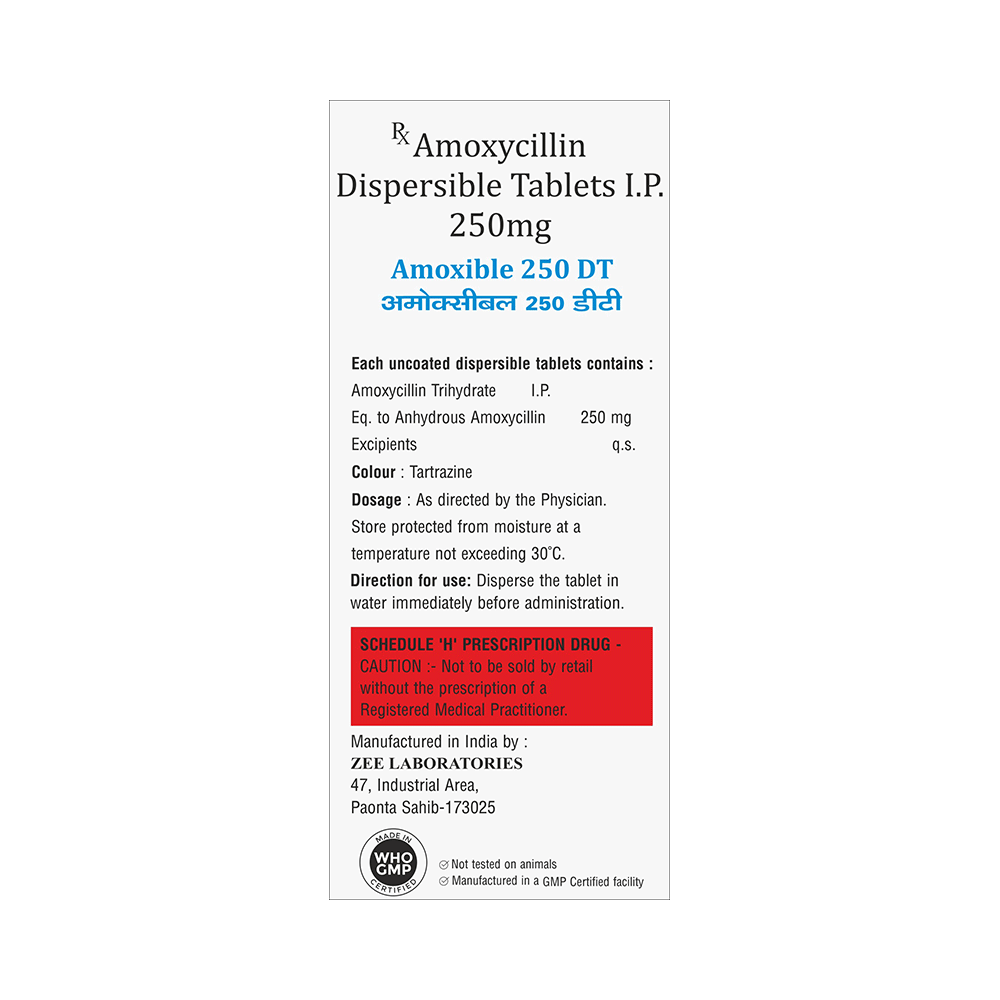 Amoxible 250 DT Tablet is used to treat a variety of bacterial infections. It is effective in infections of the throat, ear, nasal sinuses, respiratory tract (e.g., pneumonia), urinary tract, skin and soft tissue, and typhoid fever. Additionally, Amoxible 250 DT Tablet helps to eliminate a bacteria known as H. pylori in people with peptic ulcer disease. It is a broad-spectrum antibiotic that fights and stops the growth of many types of bacteria. This medicine is best taken with a meal to reduce the chance of a stomach upset. You should take it regularly at evenly spaced intervals as per the schedule prescribed by your doctor. Taking it at the same time every day will help you to remember to take it.Do not skip any doses and finish the full course of treatment even if you feel better. Stopping the medicine too early may lead to the infection returning or worsening. The total duration of treatment and precise dosage will be decided by your doctor, depending on the type of infection that you have and how well you respond to the medication.Before taking this medicine, inform your doctor if you are allergic to penicillin or any penicillin-type of medicine. Rash, vomiting, allergic reactions, nausea, and diarrhea may be seen as side effects in some patients. These are temporary and usually resolve quickly. Consult your doctor if any of these side effects persist or if your condition worsens. This medicine is generally regarded as safe to use during pregnancy if used under a doctor’s supervision.