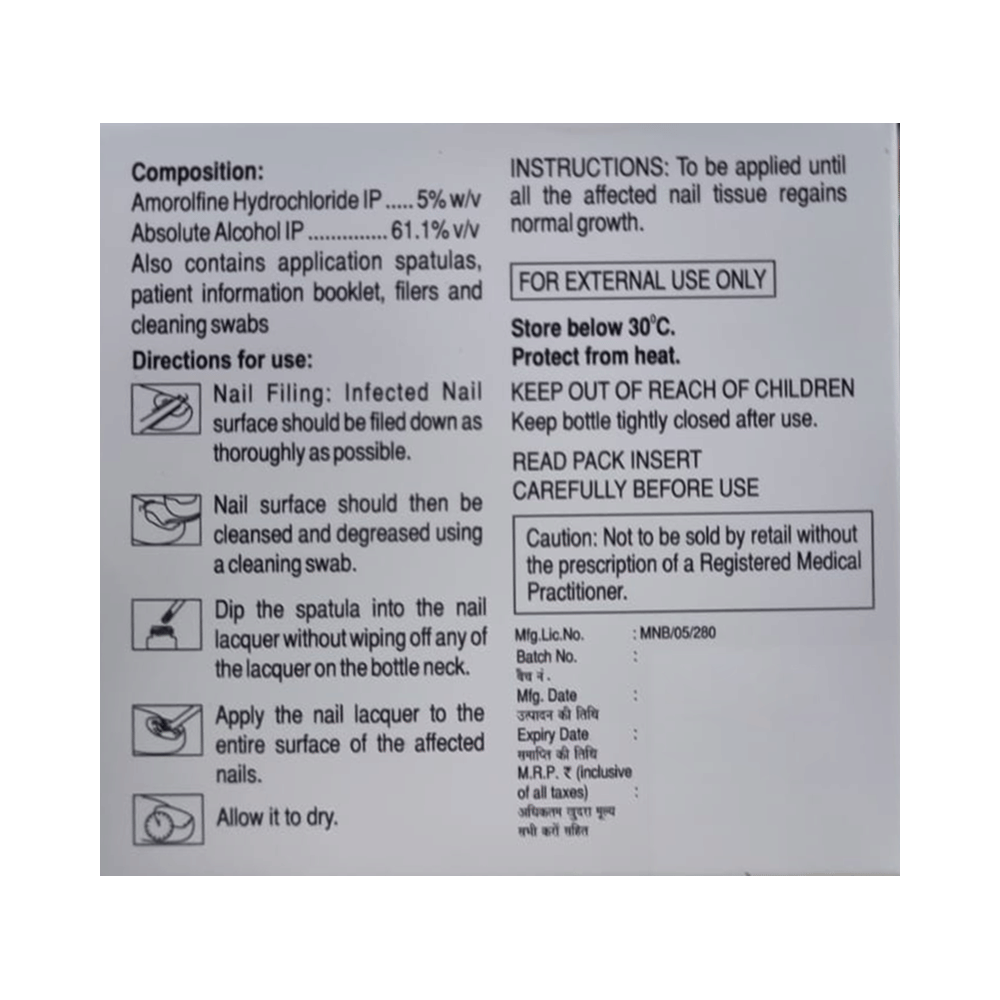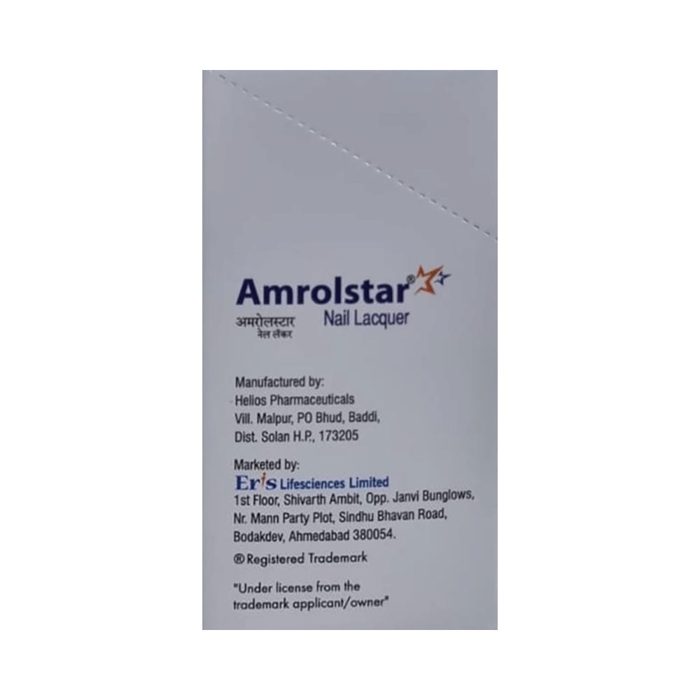 Amrolstar Nail Lacquer is an antifungal medication. It is used for treating fungal infections of the nails. It kills the fungi and helps in treating the infection. Amrolstar Nail Lacquer should be used in the dose and duration as advised by your doctor. Some of the common side effects include blisters on the skin, nail disorders like nail damage and discoloration, skin irritation, rash, or redness on the site of application. Please consult your doctor if these side effects persist for a longer duration.Make sure you wash your hands before and after applying the medicine. Avoid direct contact with the cream or ointment with your eyes. In case of direct contact, wash your eyes with water and seek immediate medical attention.