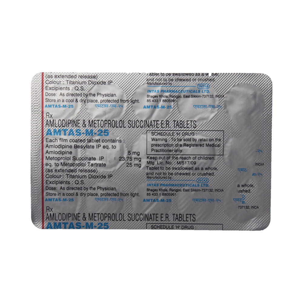 Amtas-M 25 Tablet PR contains two medicines, both of which help to control high blood pressure and heart rate. It is also used for heart-related chest pain (angina), abnormal heart rhythms and chronic (long-term) heart failure. You can take Amtas-M 25 Tablet PR at any time of day, with or without food, but it is best to take it at the same time each day. Keep taking it for as long as advised by your doctor. Even if you feel well, do not stop this medicine on your own because high blood pressure often has no symptoms. If you stop taking it, your condition may get worse. Keeping active with regular exercise, reducing your weight and eating a healthy diet will also help control your blood pressure. Follow your doctor’s advice while taking this medicine.It may cause side effects like headache, ankle swelling, skin rash, slow heart rate, nausea,a nd depression. It may also cause dizziness, so do not drive or do anything that requires mental focus until you know how this medicine affects you. This might raise the level of potassium in the blood, hence avoid potassium rich food or supplements. You may be asked for regular monitoring of blood pressure, kidney function, and electrolytes level while on the treatment.Before taking it, let your doctor know if you have any liver or kidney problems. Pregnant or breastfeeding women should also consult their doctor for advice before taking this medicine. You also need to tell your doctor what other medicines you are taking especially those used to treat high blood pressure or heart conditions.