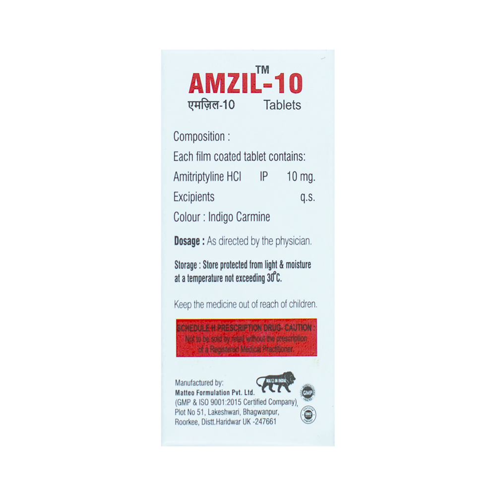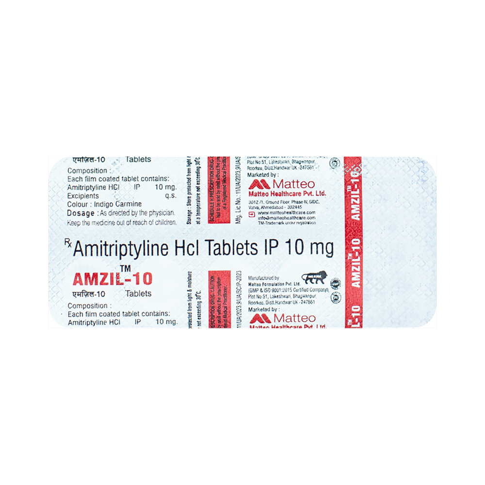 Amzil 10 Tablet is a medicine used to treat depression by helping improve mood and reduce anxiety. It works by restoring the natural balance of certain brain chemicals that affect emotions. This helps relieve sadness, improves mental well-being, and makes daily life easier to manage. Amzil 10 Tablet is normally taken before bedtime because it can make you sleepy. It can be taken with or without food. The dose and how often you need to take it will be decided by your doctor so that you get the right amount to control your symptoms.How long you need to use it will depend on what you are taking it for, but it is important to continue taking this medication even if you feel well. Do not stop taking the medicine suddenly without talking to your doctor. Stopping the medicine suddenly can worsen your condition or cause other symptoms. Your dose may be modified or gradually decreased before stopping the medication.The most common side effects of this medicine include constipation, dry mouth, sleepiness, dizziness, and headache. It may also make you aggressive or confused, and can cause weight gain in some people.This medicine is not addictive, but you can experience additional side effects (withdrawal symptoms) if you stop taking it suddenly. Your doctor may be able to suggest ways of preventing or reducing side effects if they bother you or do not go away. Serious side effects associated with this medicine are rare.