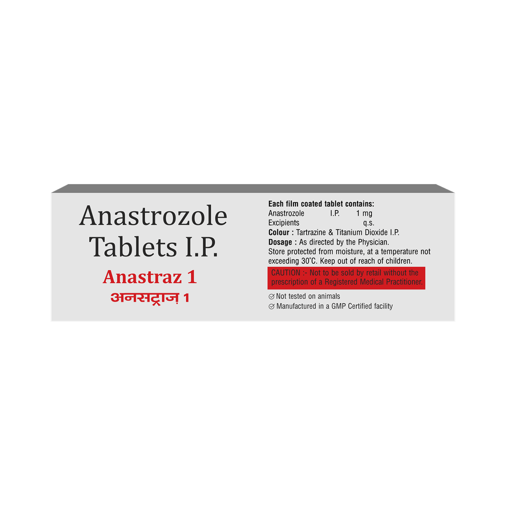 Anastraz 1 Tablet is used alone or with other treatments, such as surgery or radiation, to treat early breast cancer in postmenopausal women. It can also be used as the first line treatment of advanced breast cancer that has spread within the breast or to other areas of the body. Anastraz 1 Tablet belong to a class of drug called aromatase inhibitors, which decreases the amount of estrogen in the body. It should be taken with or without food, but take it at the same time every day to get the most benefit. It should be taken as your doctor's advice. The dose and how often you take it depends on what you are taking it for. Your doctor will decide how much you need to improve your symptoms. Swallow the tablets whole with a drink of water. You should take this medicine for as long as it is prescribed for you.The most common side effects of the medicine include hot flushes, nausea, rashes, joint pain, osteoporosis, and weakness. If these bother you or appear serious, let your doctor know. There may be ways of reducing or preventing them.Before taking this medicine, tell your doctor if you are not gone through menopause and still having menstrual periods, or you have a problem with the liver or kidney. Your doctor should also know about all other medicines you are taking as many of these may make this medicine less effective or change the way it works. Tell your doctor if you are pregnant or breastfeeding. Your doctor may perform some blood tests to check for vitamin D level or bone density.