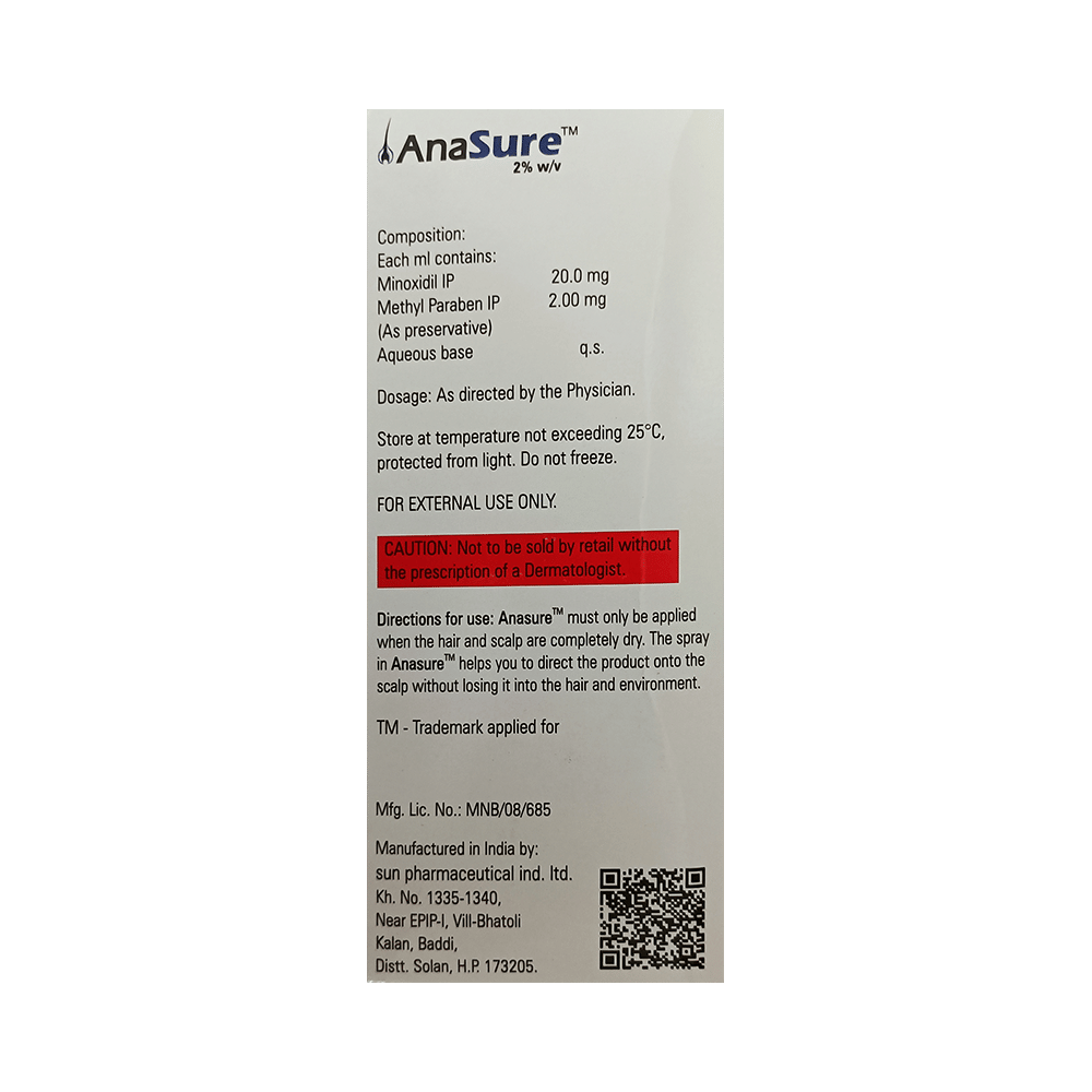 Anasure 2% Solution belongs to a class of drugs known as vasodilators. It is used to promote hair growth in men with male pattern baldness by improving blood flow to hair follicles, helping slow hair loss, and encouraging new hair growth when used regularly. Anasure 2% Solution should only be applied directly to the scalp area in the amount and in the way specified on the label or by your doctor. Clean and dry your scalp before using it. It may take approximately 2- 4 months to notice any hair growth. The first growth may be soft, colourless, and barely visible. Using more than recommended will not speed up hair growth and may increase the likelihood of side effects. This medication must be used continuously to maintain hair growth. Tell your doctor if your condition does not improve or worsen after using it for 4 to 6 months.The most common side effects of this medicine include itching, excessive hair growth, rash, and dermatitis. In case of accidental application in other areas, it may result in unwanted hair growth. Rinse thoroughly with plenty of water if you get it in your eyes, mouth, or broken skin. Talk to your doctor if you are bothered by the side effects or if they do not go away.People under 18 or over 65 should not usually use Anasure 2% Solution. It may also not be appropriate if your hair loss is due to medications (such as chemotherapy) or any nutritional deficiency. You should also not use this medicine if you have high blood pressure or use other creams or lotions to treat other scalp conditions. Talk to your doctor if you have heart disease or blood circulation problems.