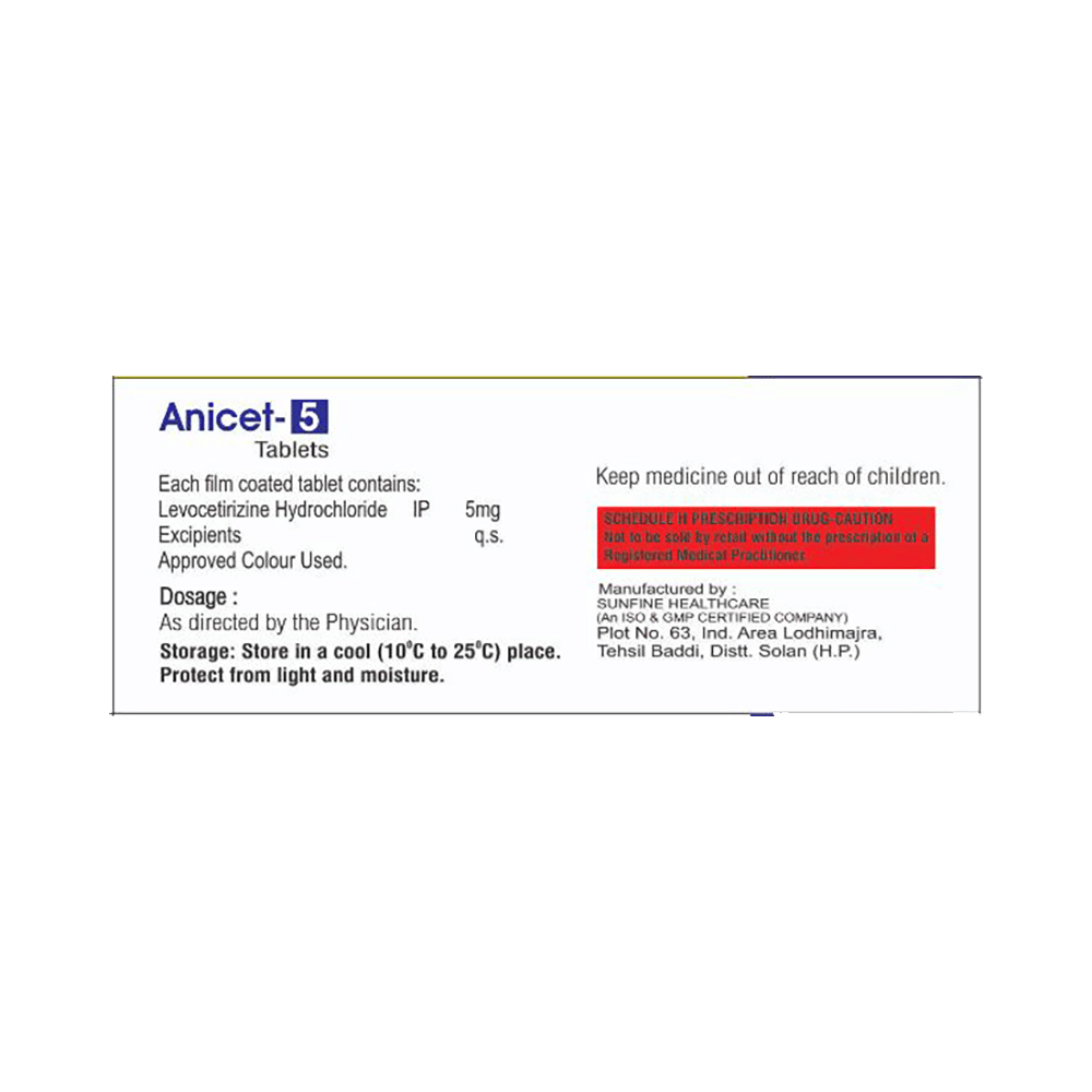 Anicet 5 Tablet is an antihistaminic medication. It treats allergy symptoms such as itching, swelling, and rashes by blocking the effects of a chemical messenger (histamine) in the body.
