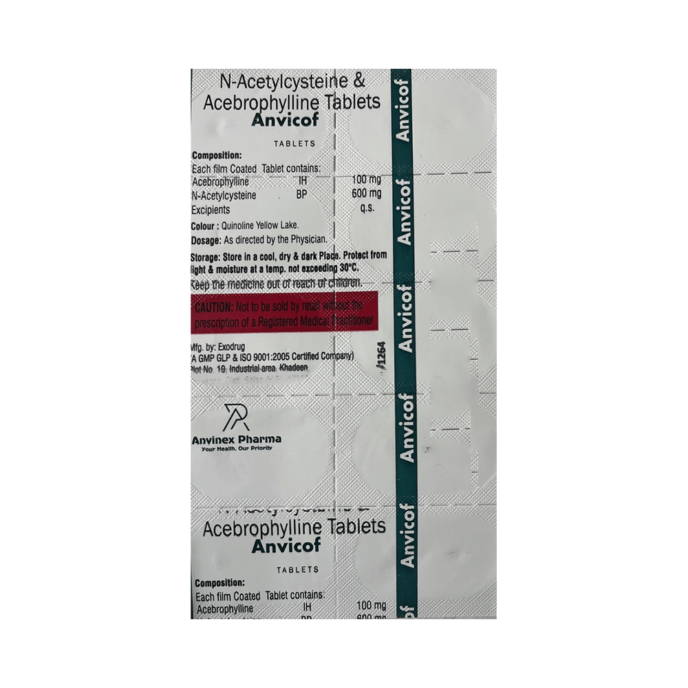 Anvicof Tablet is a combination of two medicines: Acebrophylline and Acetylcysteine. Acebrophylline is a mucolytic and bronchodilator. It works by relaxing the muscles of the airways and also thins and loosens mucus, making it easier to breathe. Acetylcysteine is a mucolytic medication. It thins and loosens mucus (phlegm), making it easier to cough out.