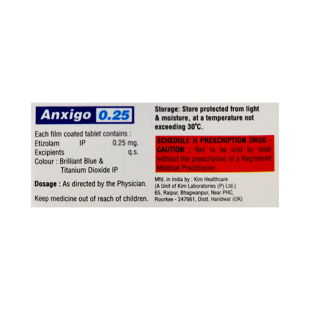 Anxigo 0.25mg Tablet is a prescription medicine used to treat anxiety and panic disorders. It alters brain activity, calms it, and provides relief from anxiety and panic attacks by relaxing the nerves. Anxigo 0.25mg Tablet may be taken with or without food. However, it is advised to take it at the same time each day, as this helps to maintain a consistent level of medicine in the body. Take this medicine in the dose and duration as advised by your doctor, as it has a high potential for habit-forming. Finish the full course of treatment even if you feel better. This medication must not be stopped suddenly without talking to the doctor.The most common side effects of this medicine are problems with coordination, low blood pressure (hypotension), and changes in sex drive. It may cause dizziness and sleepiness, so do not drive or do anything that requires mental focus until you know how this medicine affects you.Anxigo 0.25mg Tablet should be avoided in individuals with a history of substance abuse or dependence, as it can be habit-forming. Do not take Anxigo 0.25mg Tablet with alcohol or other sedatives, as it can cause excessive drowsiness and breathing difficulties. Pregnant and breastfeeding women should consult a doctor before use, as it may harm the baby. Avoid driving or operating heavy machinery, as Anxigo 0.25mg Tablet can cause drowsiness and dizziness.