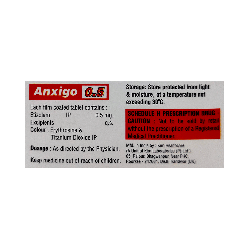 Anxigo 0.5mg Tablet is a prescription medicine used to treat anxiety and panic disorders. It alters brain activity, calms it, and provides relief from anxiety and panic attacks by relaxing the nerves. Anxigo 0.5mg Tablet may be taken with or without food. However, it is advised to take it at the same time each day, as this helps to maintain a consistent level of medicine in the body. Take this medicine in the dose and duration as advised by your doctor, as it has a high potential for habit-forming. Finish the full course of treatment even if you feel better. This medication must not be stopped suddenly without talking to the doctor.The most common side effects of this medicine are problems with coordination, low blood pressure (hypotension), and changes in sex drive. It may cause dizziness and sleepiness, so do not drive or do anything that requires mental focus until you know how this medicine affects you.Anxigo 0.5mg Tablet should be avoided in individuals with a history of substance abuse or dependence, as it can be habit-forming. Do not take Anxigo 0.5mg Tablet with alcohol or other sedatives, as it can cause excessive drowsiness and breathing difficulties. Pregnant and breastfeeding women should consult a doctor before use, as it may harm the baby. Avoid driving or operating heavy machinery, as Anxigo 0.5mg Tablet can cause drowsiness and dizziness.