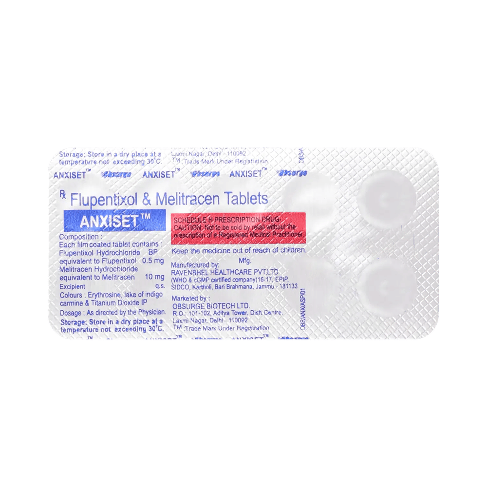 ANXISet 0.5mg/10mg Tablet is a combination of two medicines: Flupenthixol and Melitracen. Flupenthixol is a typical antipsychotic. It works by blocking the action of dopamine, a chemical messenger in the brain that affects thoughts and mood. Melitracen is a tricyclic antidepressant which increases the levels of chemical messengers in the brain that help in regulating the mood and treat depression.