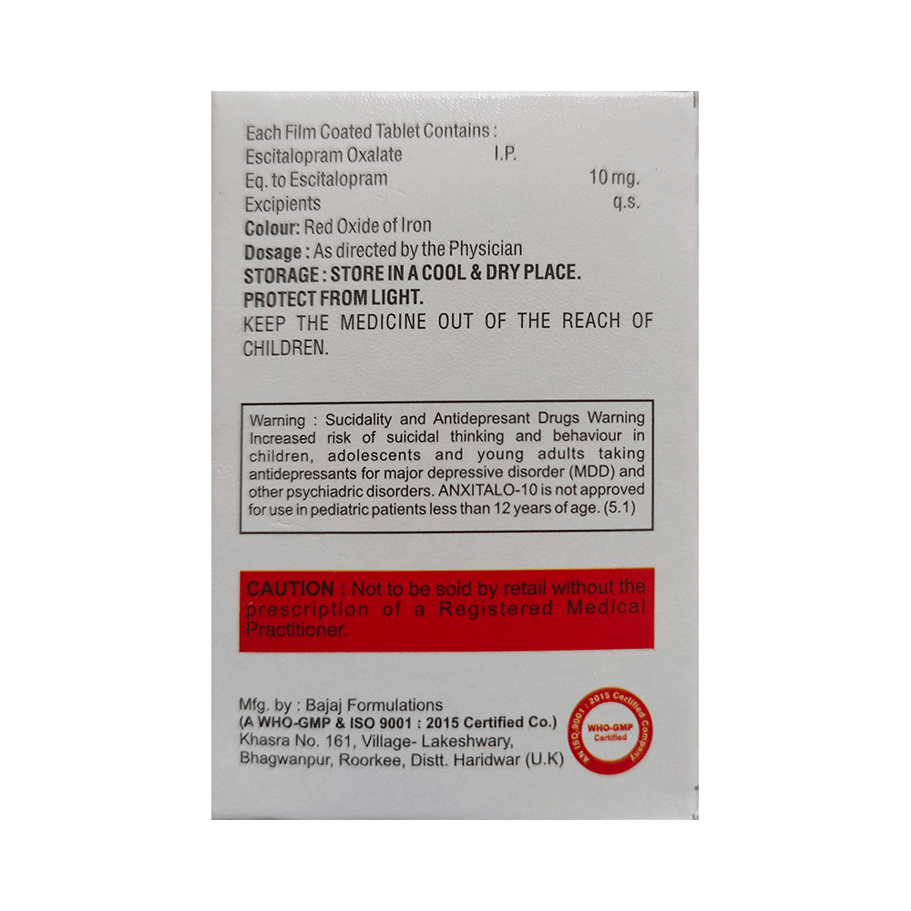 Anxitalo 10 Tablet is widely prescribed to treat depression and other mental health conditions like anxiety, panic disorder, and obsessive-compulsive disorder. It is a type of antidepressant known as a selective serotonin reuptake inhibitor (SSRI). Anxitalo 10 Tablet helps recover from depression by improving mood and relieving anxiety and tension. It can be taken with or without food. The dose and how often you need it will be decided by your doctor based on the amount needed to control your symptoms. Your doctor may start you on a lower dose and increase it gradually. Do not change the dose or stop taking it without talking to your doctor, even if you feel well. Doing so may make your condition worse or you may suffer from unpleasant withdrawal symptoms such as anxiety, restlessness, palpitations, dizziness, sleep disturbances.To get the most benefit, take this medicine regularly at the same time each day. Your doctor may advise you to take it in the morning if you have trouble sleeping. It may take a few weeks before you start feeling better. Let your doctor know if you do not see any improvement even after 4 weeks.Some common side effects of this medicine include nausea, fatigue, increased sweating, insomnia (difficulty in sleeping), decreased sexual drive, delayed ejaculation, and women may experience difficulties achieving orgasm. Some people may experience sleepiness after taking this medicine. Let your doctor know straight away if you develop any sudden worsening of mood or any thoughts about harming yourself.Before taking Anxitalo 10 Tablet, you should tell your doctor if you have epilepsy (seizure disorder or fits), diabetes, liver or kidney disease, any heart problems, or are currently taking medicines for depression known as MAO inhibitors. These may affect your treatment. Please tell your doctor about all the medicines you are taking to make sure you are safe.