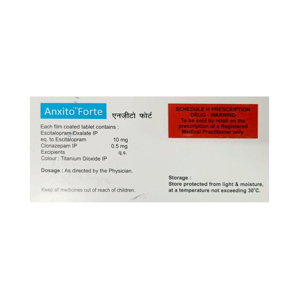 Anxito Forte Tablet is a prescription medicine used to treat anxiety disorder. It is the combination medicine that calms the brain by decreasing the abnormal and excessive activity of the nerve cells. It also works by increasing the level of a chemical messenger in the brain which improves mood. Anxito Forte Tablet can be taken with or without food. However, it is advised to take it at the same time each day as this helps to maintain a consistent level of medicine in the body. Take this medicine in the dose and duration advised by your doctor as it has habit-forming potential. If you miss a dose of this medicine, take it as soon as you remember. Finish the full course of treatment even if you feel better. It is important not to stop taking this medicine suddenly as it may cause withdrawal symptoms.Some common side effects of this medicine include delayed ejaculation, low sexual desire, vomiting, memory impairment, depression, and confusion. It may also cause dizziness and sleepiness. So, do not drive or do anything that requires mental focus until you know how this medicine affects you. It may cause weight gain or weight loss depending upon person to person. To prevent weight gain, you can eat a balanced diet and exercise regularly. On the other hand, weight loss can be prevented by increasing food portions in your diet. It is important to inform your doctor if you develop any unusual changes in mood as it can cause suicidal thoughts.Take caution while taking medicine if you are suffering from liver disease. Your doctor should also know about all other medicines you are taking as many of these may make this medicine less effective or change the way it works. Inform your doctor if you are pregnant, planning pregnancy or breastfeeding.