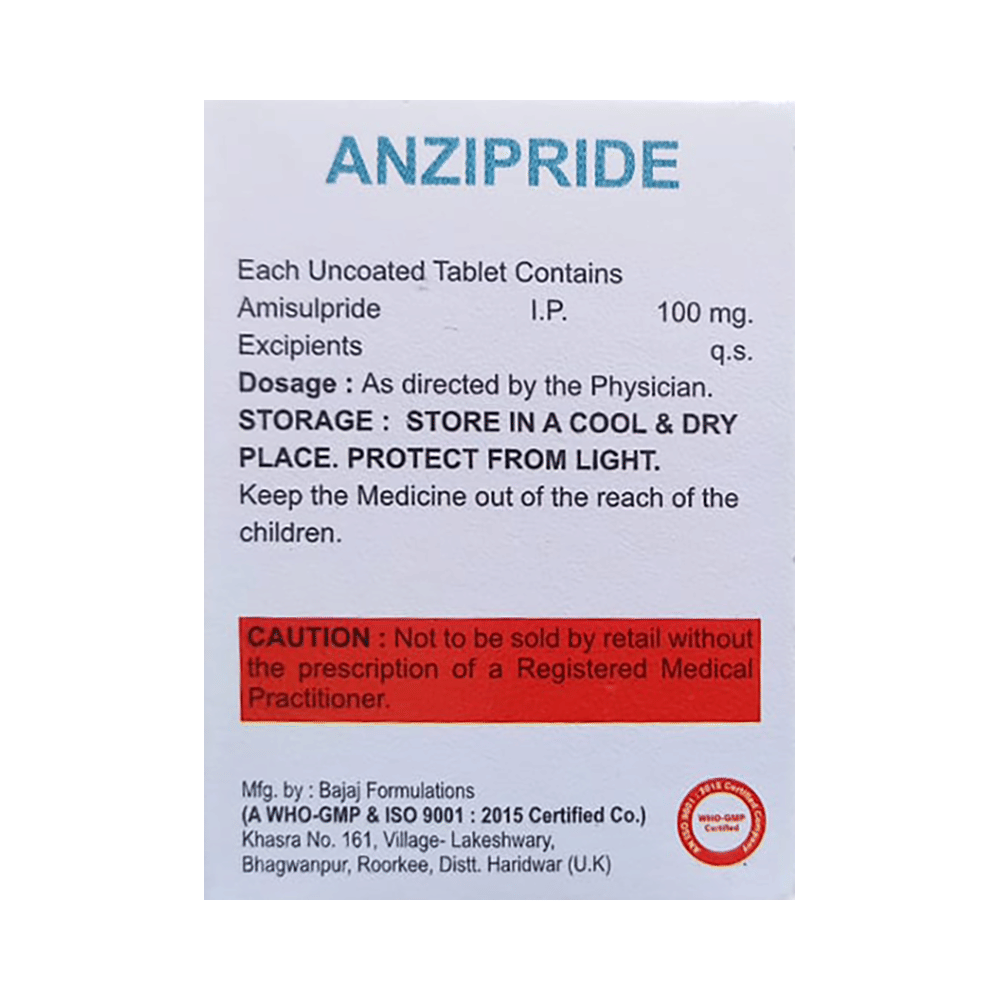 Anzipride Tablet is a prescription medicine used in the treatment of schizophrenia, a mental disorder that can result in hallucinations or delusions and also adversely affects a person’s ability to think and behave. Anzipride Tablet may be taken with or without food, preferably before bedtime. However, it is advised to take it at the same time each day as this helps to maintain a consistent level of medicine in the body. Take this medicine in the dose and duration as advised by your doctor and if you have missed a dose, take it as soon as you remember. Do not skip any doses and finish the full course of treatment even if you feel better. It is important that this medication is not stopped suddenly without talking to your doctor as it may worsen your symptoms.Some common side effects of this medicine include nausea, vomiting, dryness in the mouth, blurred vision, insomnia, and erectile dysfunction. Initially, this medicine may cause a sudden drop in blood pressure when you change positions, so it is better to rise slowly if you have been sitting or lying down. It also causes dizziness and sleepiness, so do not drive or do anything that requires mental focus until you know how this medicine affects you. This medicine can lead to weight gain and may increase your blood sugar and cholesterol levels. However, modifying your lifestyle by having a healthy diet and exercising regularly can reduce this side effect.