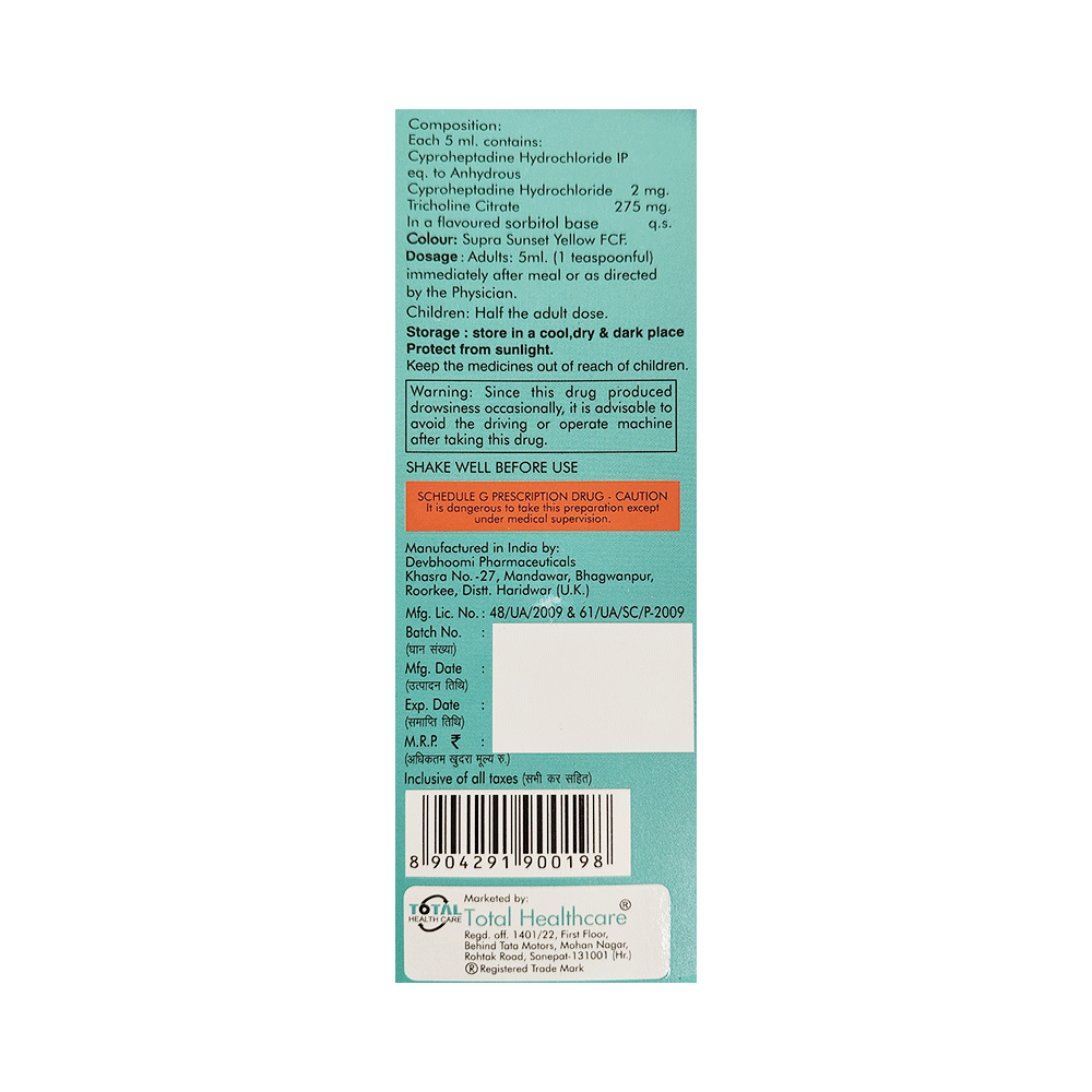 Salt Composition: Cyproheptadine (2mg/5ml) + Tricholine Citrate (275mg/5ml)