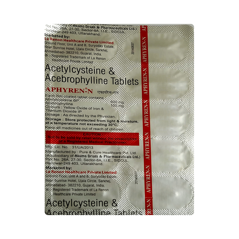 Aphyren-N Tablet is a combination of two medicines: Acebrophylline and Acetylcysteine. Acebrophylline is a mucolytic and bronchodilator. It works by relaxing the muscles of the airways and also thins and loosens mucus, making it easier to breathe. Acetylcysteine is a mucolytic medication. It thins and loosens mucus (phlegm), making it easier to cough out.