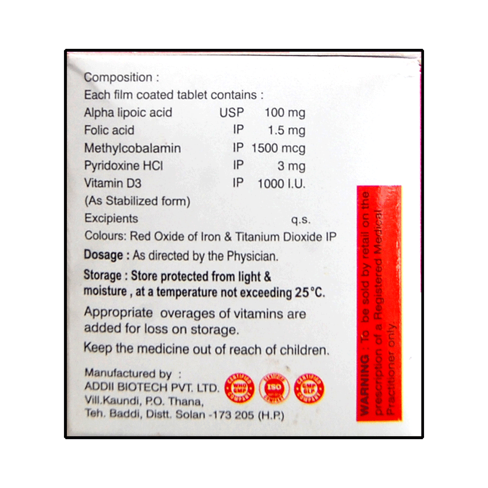 Salt Composition: Methylcobalamin (1500mcg) + Alpha Lipoic Acid (100mg) + Vitamin B6 (Pyridoxine) (3mg) + Folic Acid (1.5mg) + Vitamin D3 (1000IU)