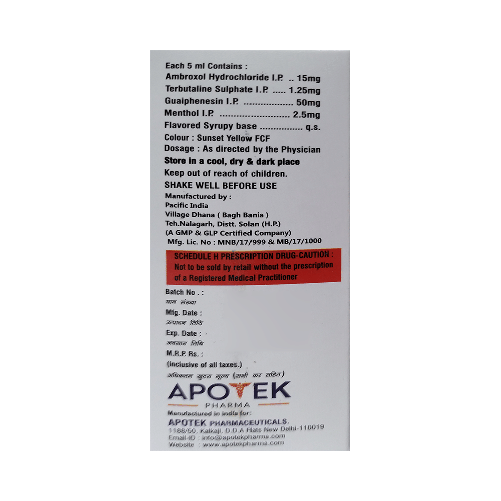 Apotuss Syrup is a combination of four medicines: Ambroxol, Guaifenesin, Menthol and Terbutaline.