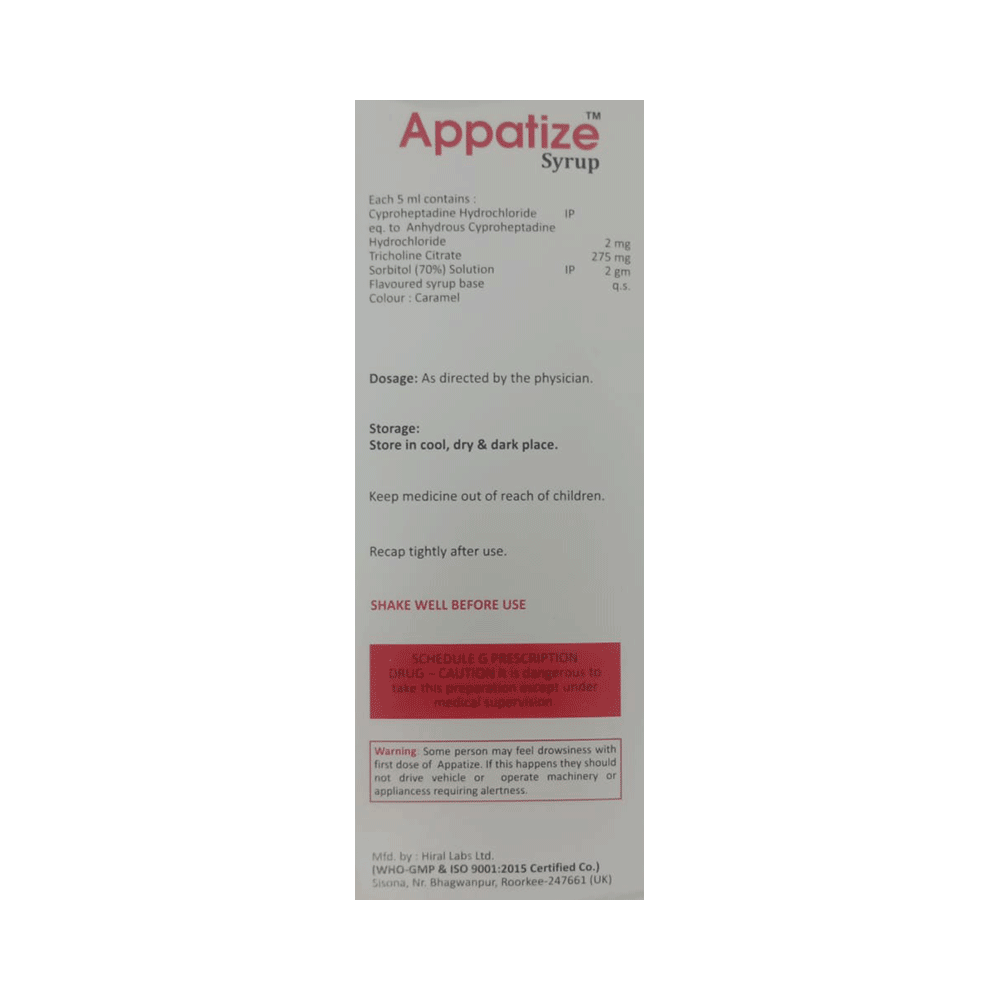 Appatize Syrup is a combination medicine used to treat loss of appetite. It is an effective appetite stimulant. It works by reducing the effect of a chemical messenger which regulates appetite. Appatize Syrup is taken with or without food in a dose and duration as advised by the doctor. The dose you are given will depend on your condition and how you respond to the medicine. You should keep taking this medicine for as long as your doctor recommends. Let your healthcare team know about all other medications you are taking as some may affect, or be affected by this medicine.The most common side effects are constipation, dryness in the mouth, and blurred vision. Most of these are temporary and usually resolve with time. Contact your doctor straight away if you are concerned about any of these. It can cause dizziness, so do not drive or do anything that requires mental focus until you know how this medicine affects you. Avoid drinking alcohol while taking this medicine as it can worsen your sleepiness.Before taking Appatize Syrup, inform your doctor if you have any kidney or liver diseases so that your doctor can prescribe a suitable dose for you. Pregnant or breastfeeding women should also consult their doctor before taking this medicine.
