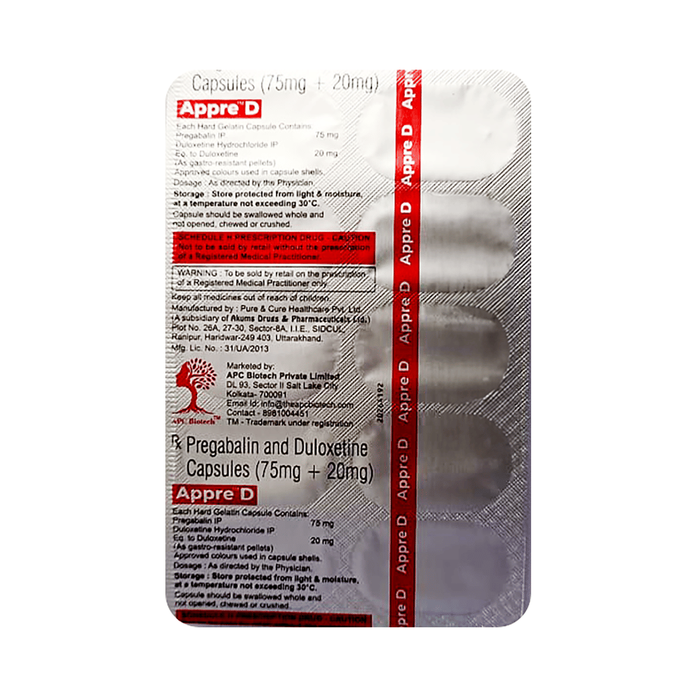 Appre D Capsule is a combination of two medicines: pregabalin and duloxetine. Pregabalin decreases neurotransmitter release, while duloxetine boosts serotonin and norepinephrine levels to modulate pain perception, working together to relieve nerve pain.