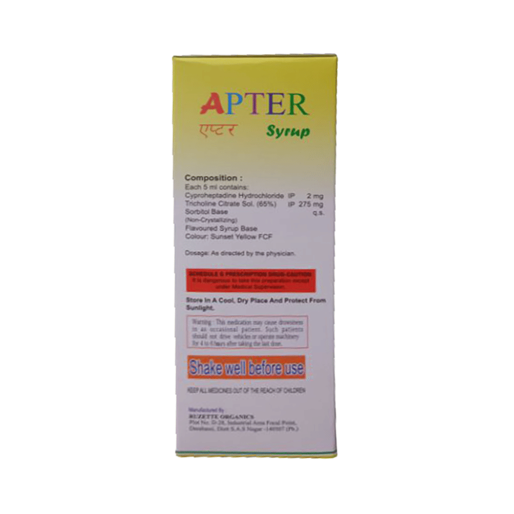 Apter Syrup is a combination medicine used to treat loss of appetite. It is an effective appetite stimulant. It works by reducing the effect of a chemical messenger which regulates appetite. Apter Syrup is taken with or without food in a dose and duration as advised by the doctor. The dose you are given will depend on your condition and how you respond to the medicine. You should keep taking this medicine for as long as your doctor recommends. Let your healthcare team know about all other medications you are taking as some may affect, or be affected by this medicine.The most common side effects are constipation, dryness in mouth, and blurred vision. Most of these are temporary and usually resolve with time. Contact your doctor straight away if you are at all concerned about any of these side effects. It can cause dizziness, so do not drive or do anything that requires mental focus until you know how this medicine affects you. Avoid drinking alcohol while taking this medicine as it can worsen your sleepiness.Never support self-medication or recommend your medicine to another person. Before taking it, you should tell your doctor if you have any kidney or liver diseases so that your doctor can prescribe a suitable dose for you. Pregnant or breastfeeding women should also consult their doctor.
