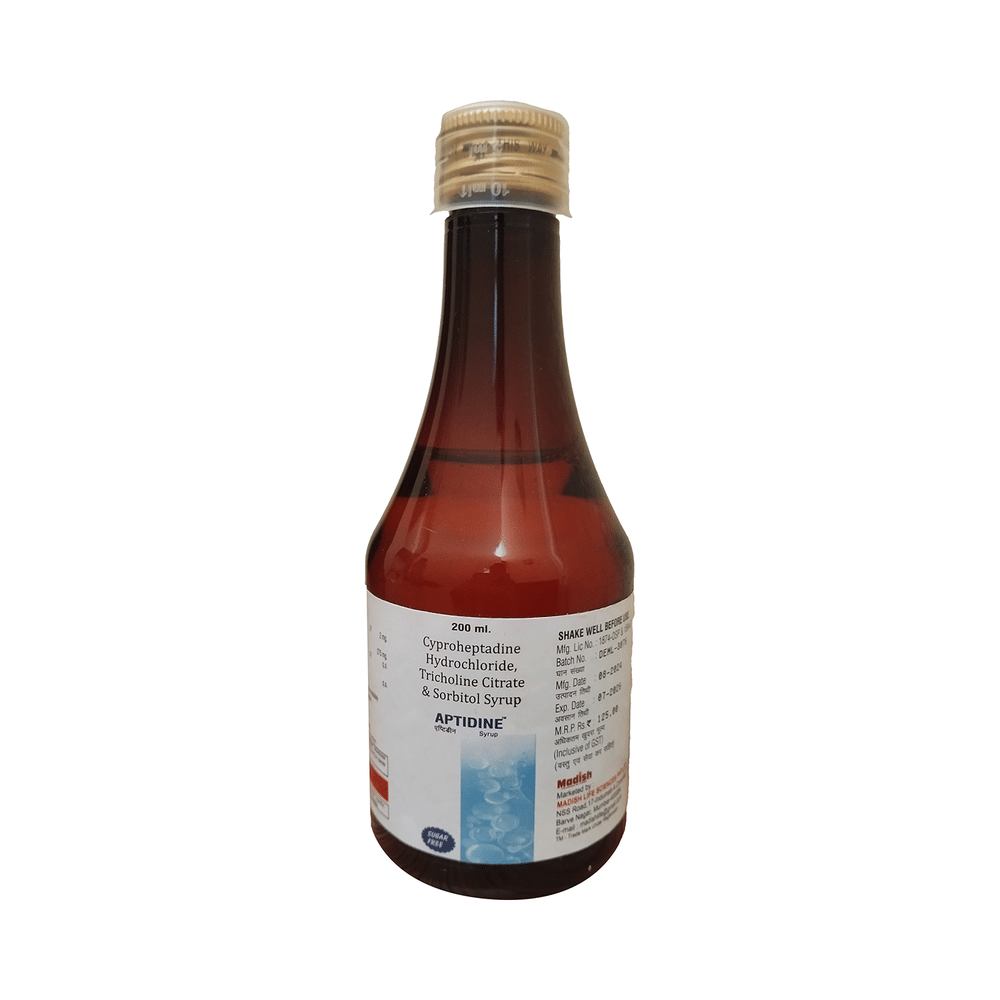 Aptidine Syrup Sugar Free is a combination medicine used to treat loss of appetite. It is an effective appetite stimulant. It works by reducing the effect of a chemical messenger which regulates appetite. Aptidine Syrup Sugar Free is taken with or without food in a dose and duration as advised by the doctor. The dose you are given will depend on your condition and how you respond to the medicine. You should keep taking this medicine for as long as your doctor recommends. Let your healthcare team know about all other medications you are taking as some may affect, or be affected by this medicine.The most common side effects are constipation, dryness in the mouth, and blurred vision. Most of these are temporary and usually resolve with time. Contact your doctor straight away if you are concerned about any of these. It can cause dizziness, so do not drive or do anything that requires mental focus until you know how this medicine affects you. Avoid drinking alcohol while taking this medicine as it can worsen your sleepiness.Before taking Aptidine Syrup Sugar Free, inform your doctor if you have any kidney or liver diseases so that your doctor can prescribe a suitable dose for you. Pregnant or breastfeeding women should also consult their doctor before taking this medicine.