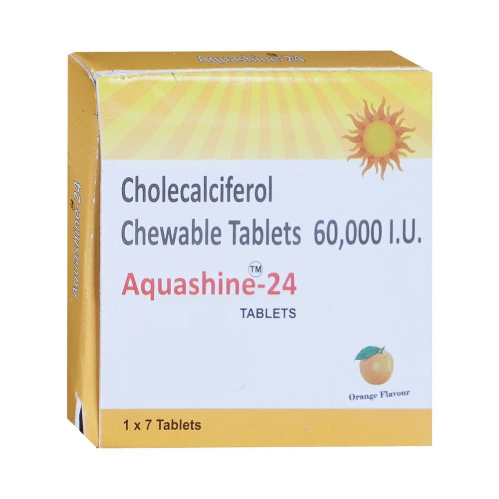 Aquashine 24 Tablet is used in the treatment of vitamin D deficiency and osteoporosis. It helps the body to absorb calcium. Calcium is essential for maintaining strong and healthy bones. It is used when your diet does not provide enough calcium. Aquashine 24 Tablet should be taken as directed by your doctor. It is best taken with or after food, as this helps your body absorb it, and you should take it regularly to get the most benefits. If you are using it to treat osteoporosis, you will also be prescribed other medicines. This medicine may be only part of a complete treatment program that includes making changes to your diet and taking calcium and vitamin supplements. Learn about the foods you should eat to ensure you get enough calcium and vitamin D.Aquashine 24 Tablet has few side effects, and none are common. If you take too much, you may feel weakness, muscle pain, or a metallic taste in your mouth. If you experience any such side effects, speak with your doctor. They may be able to help you reduce or treat the symptoms.Before taking this medicine, tell your doctor if you have high calcium levels in your blood or if you have any heart, kidney, or liver disease. Some other medicines can decrease the absorption of vitamin D3, so let your doctor know about all the other medicines you are taking to make sure you are safe. This medicine may help during pregnancy when your body needs more vitamin D, but too much could harm your baby. Discuss it with your doctor.