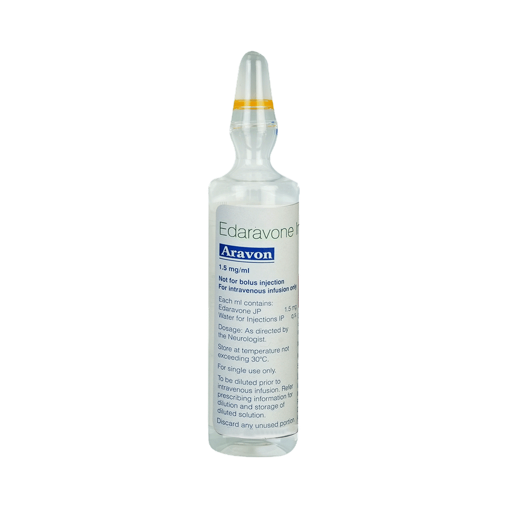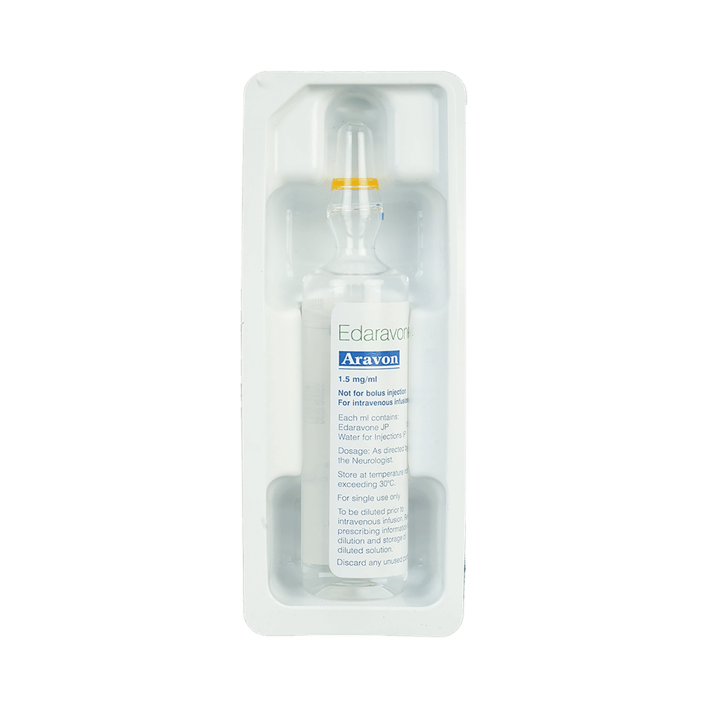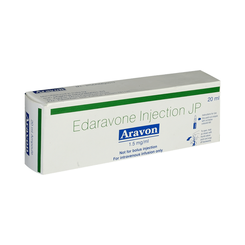 Aravon Injection is used to treat amyotrophic lateral sclerosis (a disease that weakens muscles and impairs function) and neurological damage caused by ischemic stroke. It also reduces nerve damage, slows disease progression, and protects brain cells by reducing oxidative stress after an ischemic stroke. Aravon Injection is administered as an injection under the supervision of a doctor or a nurse and should not be self-administered. It is given in cases where oral administration is not possible. Make sure to receive all dosages and follow all your doctor’s instructions for maximum benefits.The most common side effects of this medicine are headache, bruising, and walking difficulties (gait disturbance). You may also notice some injection site reactions such as pain, redness, or swelling. However, these are temporary and usually resolve on their own. Please consult your doctor if these do not subside.You should inform the doctor if you develop any allergic reactions, like itching or swelling of the lips, tongue, or face, after taking the medication, as these require immediate medical attention. Pregnant and breastfeeding women should consult their doctors before taking this medicine to make sure it is safe for them.