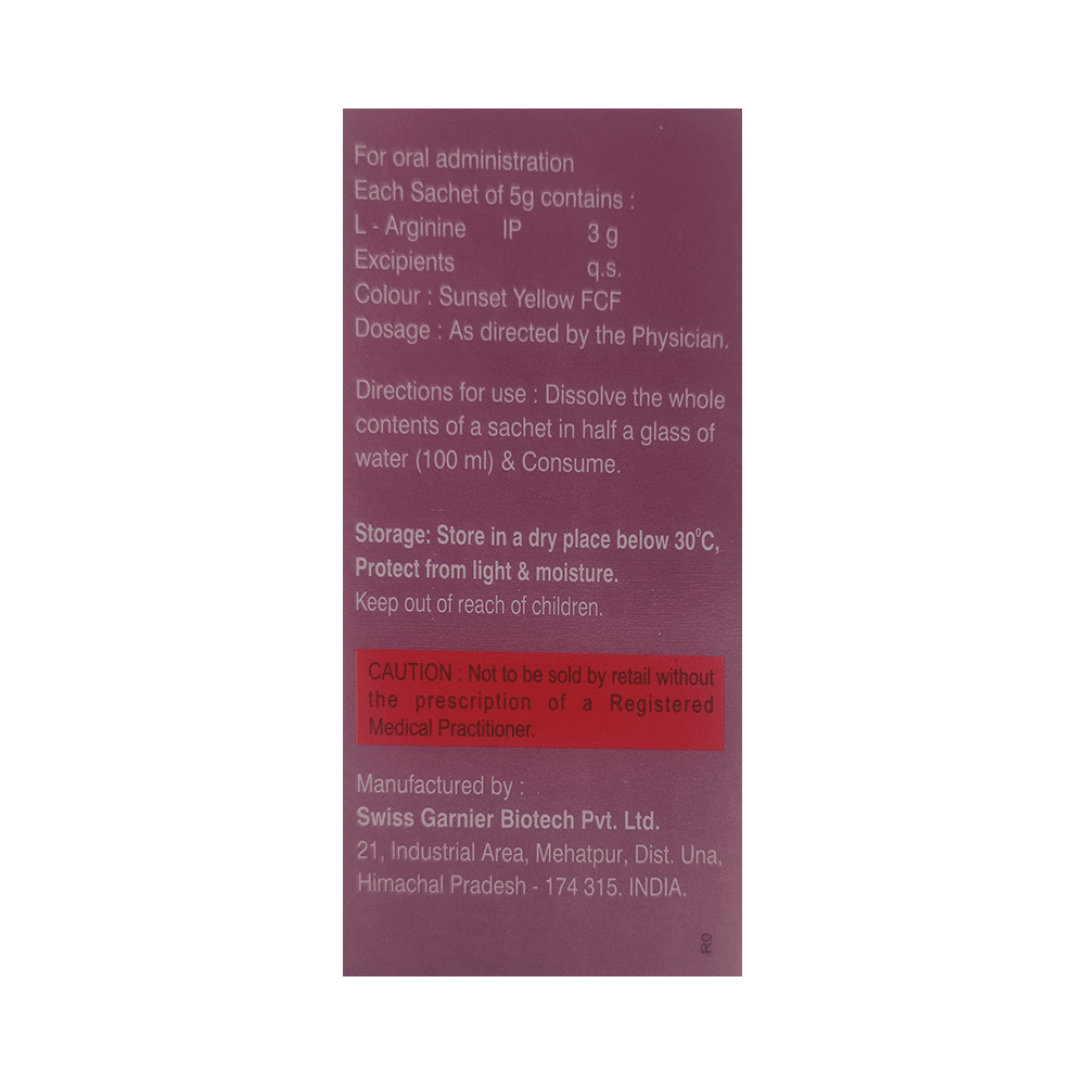 Argibiz Sachet Orange Sugar Free is a non-essential amino acid. It is used in the treatment of nutritional deficiencies. It helps to improve vascular and heart health. Additionally, it promotes muscle growth, thus can also be used for bodybuilding. Argibiz Sachet Orange Sugar Free should be taken in the dose and duration as advised by the doctor. An overdose of this medicine may have harmful effects on your health. It can be taken with or without food.This medicine is usually safe, however, it may cause nausea, bloating, and diarrhea, etc. as side effects. Some people may also experience low blood pressure after taking the medicine.Patients with a history of acute heart disease should take this medicine only when prescribed by the doctor. During the course of the treatment, your doctor may suggest some diagnostic and laboratory (blood and urine) tests to know the effects of the medicine on the body.